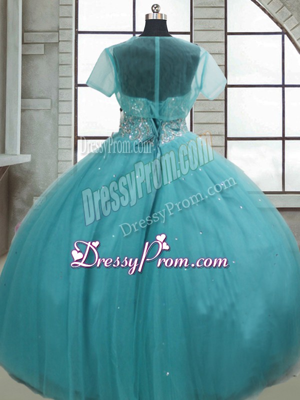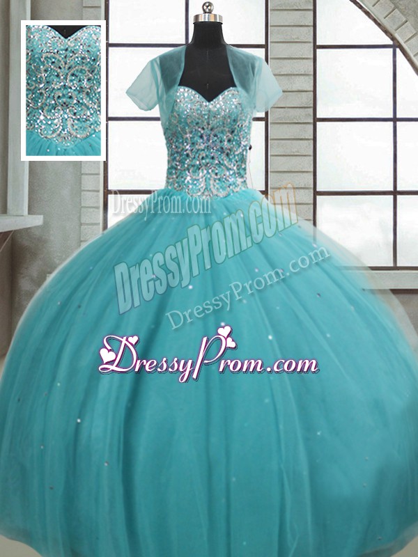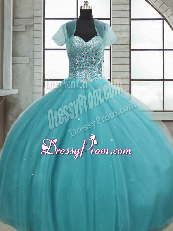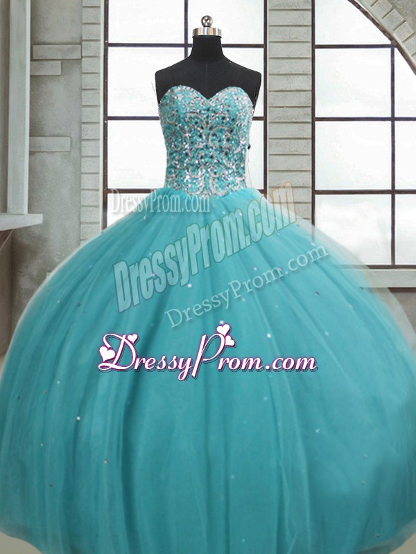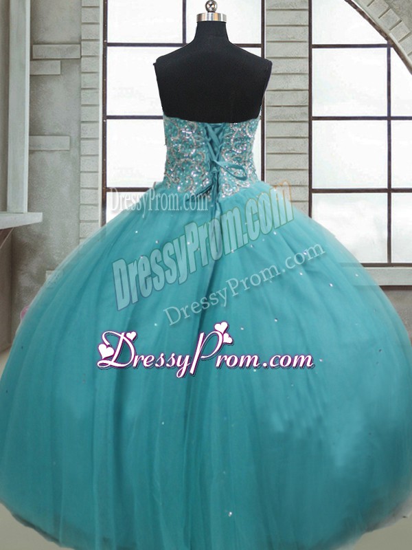 Neckline : SweetheartShown Color : Aqua BlueSilhouette : Ball GownsSleeve Length : sleevelessHemline : floor lengthBack Detail : Lace upFabric : TulleEmbellishment : Beading,SequinsOccasion : Military Ball,Sweet 16,QuinceaneraSeason : Spring,Summer,Fall,Winter