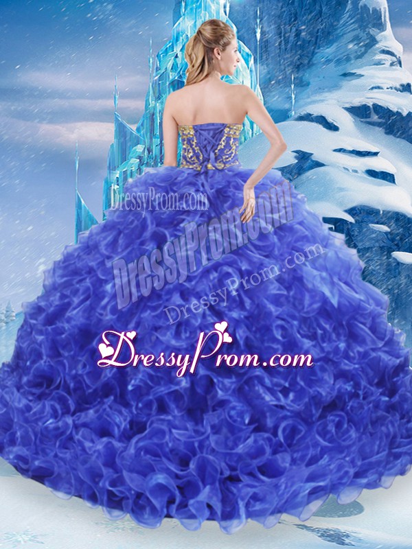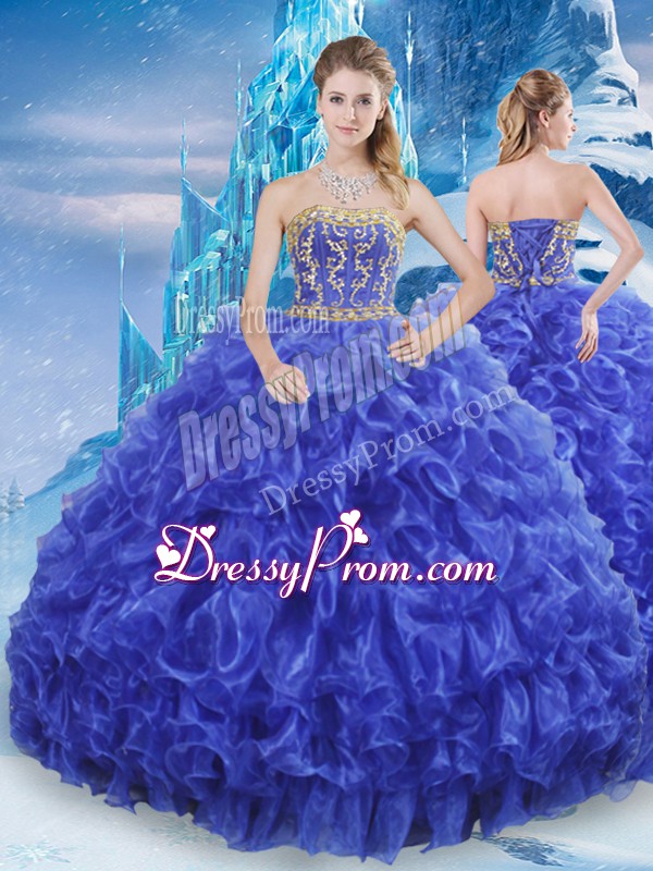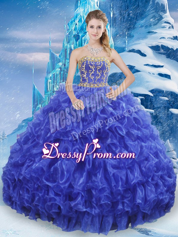 Delicate Organza Strapless Sleeveless Lace Up Beading and Appliques and Ruffles 15 Quinceanera Dress in Royal Blue