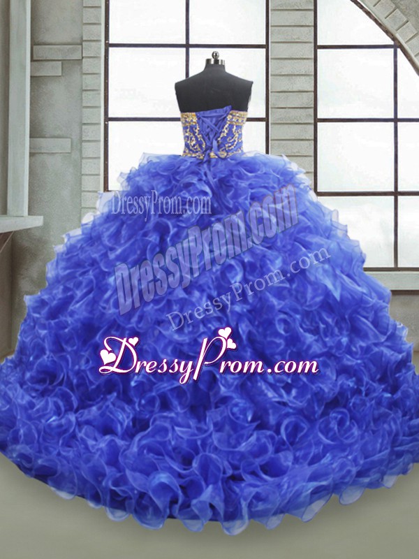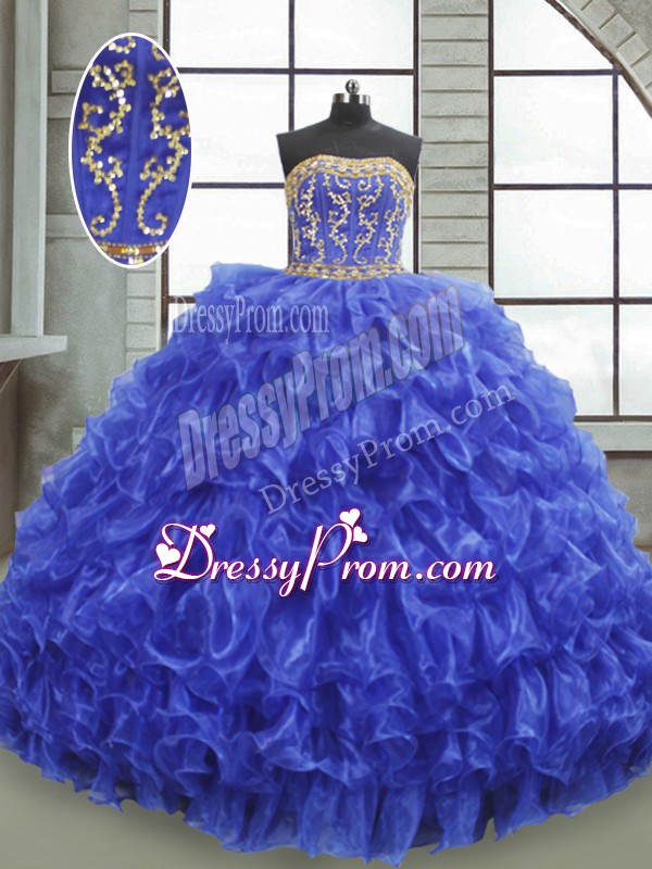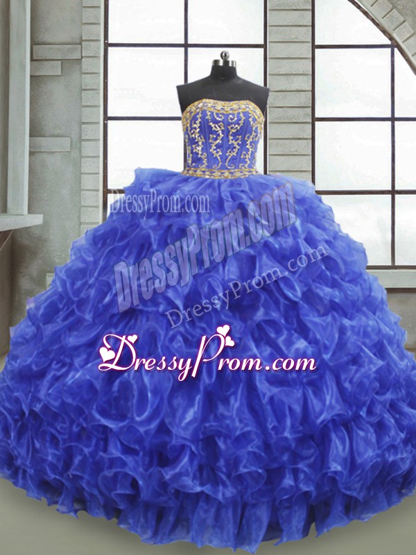 Neckline : StraplessShown Color : Royal BlueSilhouette : Ball GownsSleeve Length : sleevelessHemline : floor lengthBack Detail : Lace upFabric : OrganzaEmbellishment : Beading,Appliques,RufflesOccasion : Military Ball,Sweet 16,QuinceaneraSeason : Spring,Summer,Fall,Winter