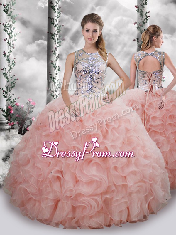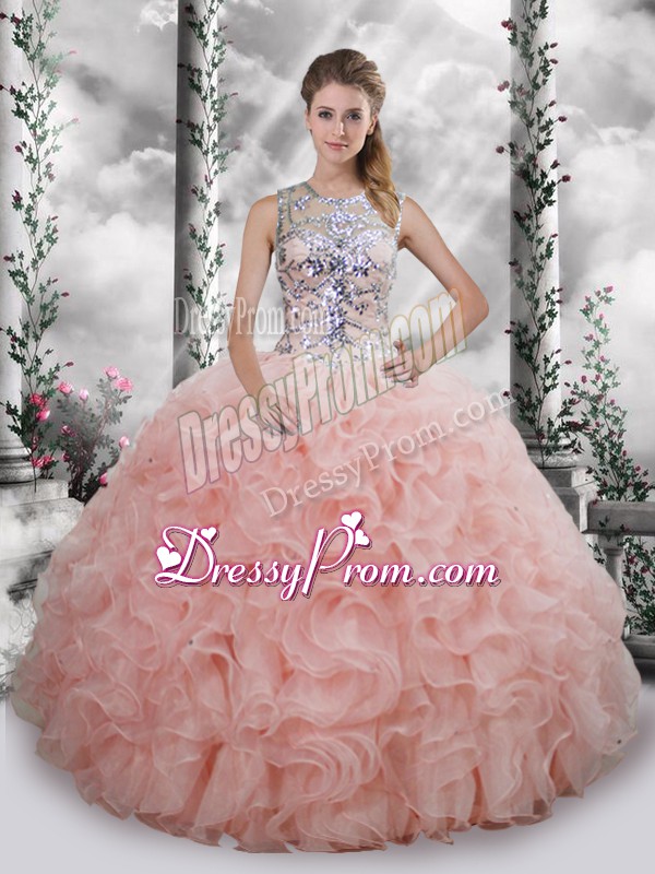 Latest Scoop Sleeveless Vestidos de Quinceanera Floor Length Beading and Ruffles Baby Pink Organza