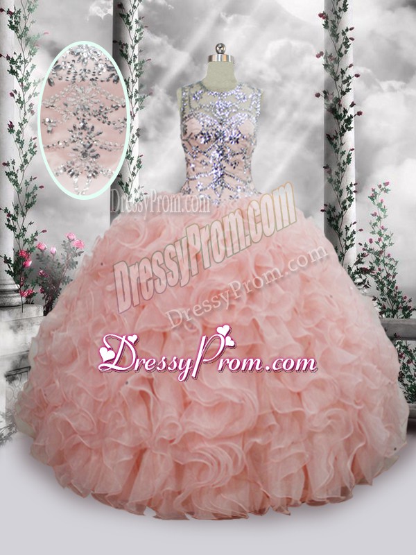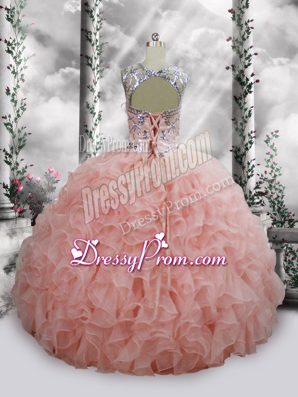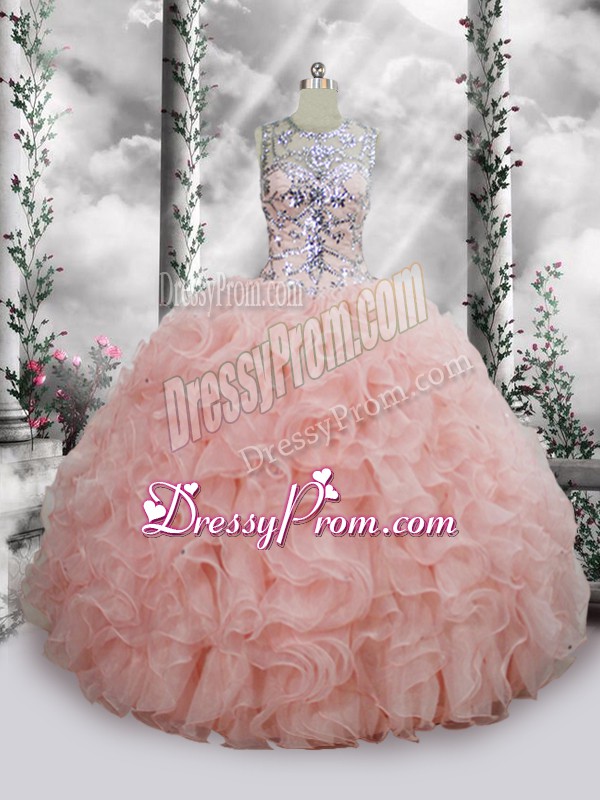 Neckline : ScoopShown Color : Baby PinkSilhouette : Ball GownsSleeve Length : sleevelessHemline : floor lengthBack Detail : Lace upFabric : OrganzaEmbellishment : Beading,RufflesOccasion : QuinceaneraSeason : Spring,Summer,Fall,Winter