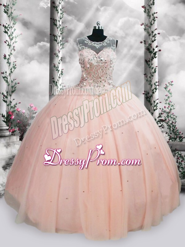 Neckline : ScoopShown Color : Pink Silhouette : Ball GownsSleeve Length : sleevelessHemline : floor lengthBack Detail : Lace upFabric : TulleEmbellishment : Beading,SequinsOccasion : Military Ball,Sweet 16,QuinceaneraSeason : Spring,Summer,Fall,Winter