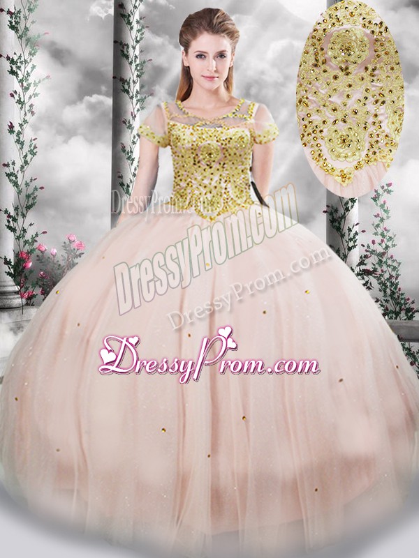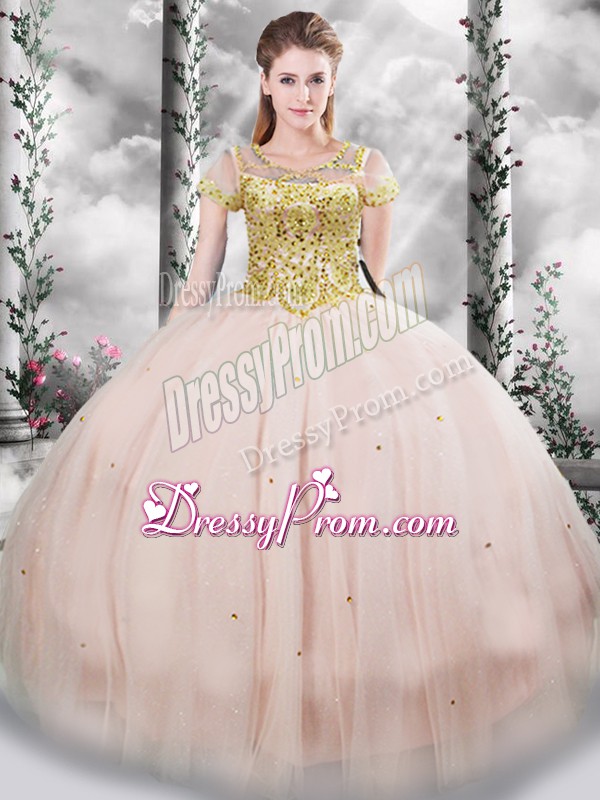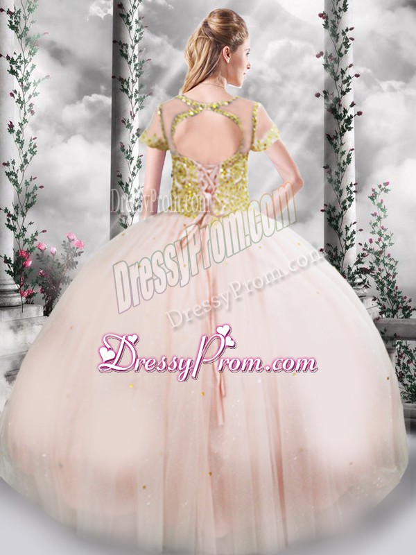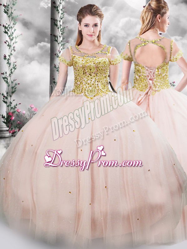 Neckline : ScoopShown Color : Pink Silhouette : Ball GownsSleeve Length : short sleevesHemline : floor lengthBack Detail : Lace upFabric : TulleEmbellishment : BeadingOccasion : Military Ball,Sweet 16,QuinceaneraSeason : Spring,Summer,Fall,Winter
