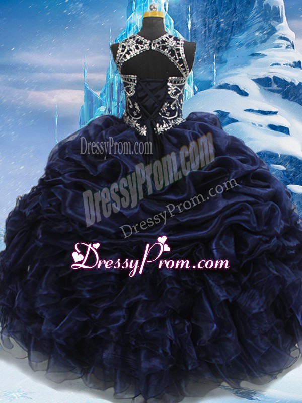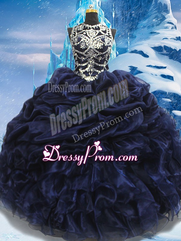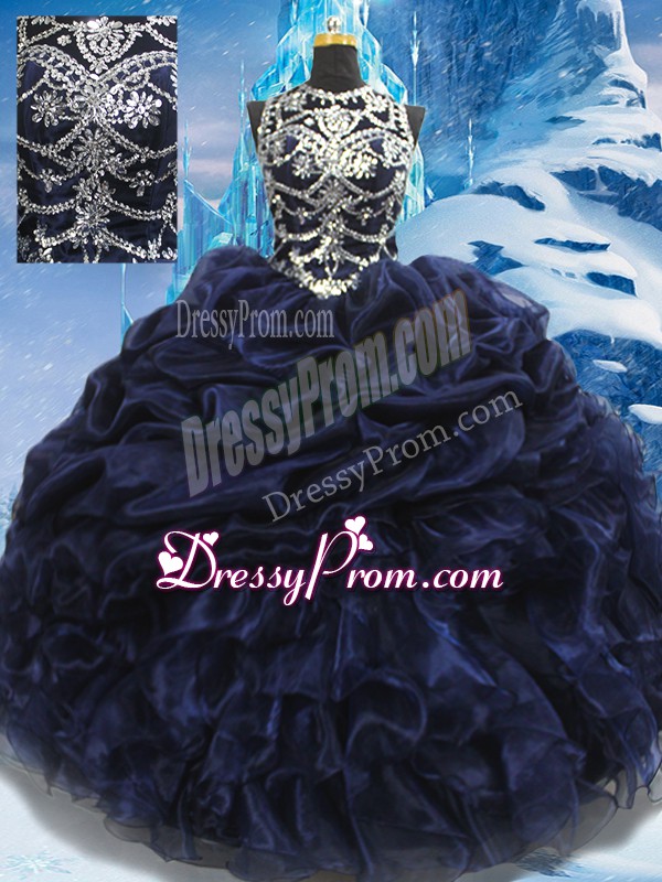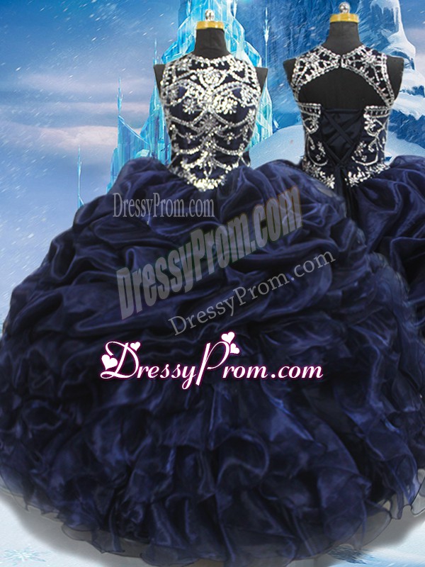 Neckline : High-neckShown Color : Navy BlueSilhouette : Ball GownsSleeve Length : sleevelessHemline : floor lengthBack Detail : Lace upFabric : TaffetaEmbellishment : Appliques,Ruffles,Pick UpsOccasion : Military Ball,Sweet 16,QuinceaneraSeason : Spring,Summer,Fall,Winter