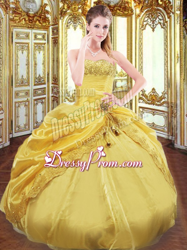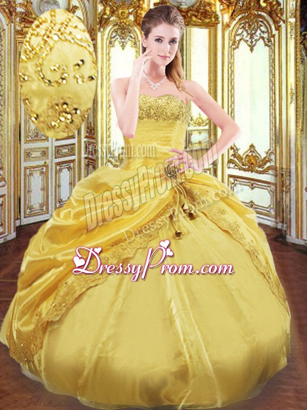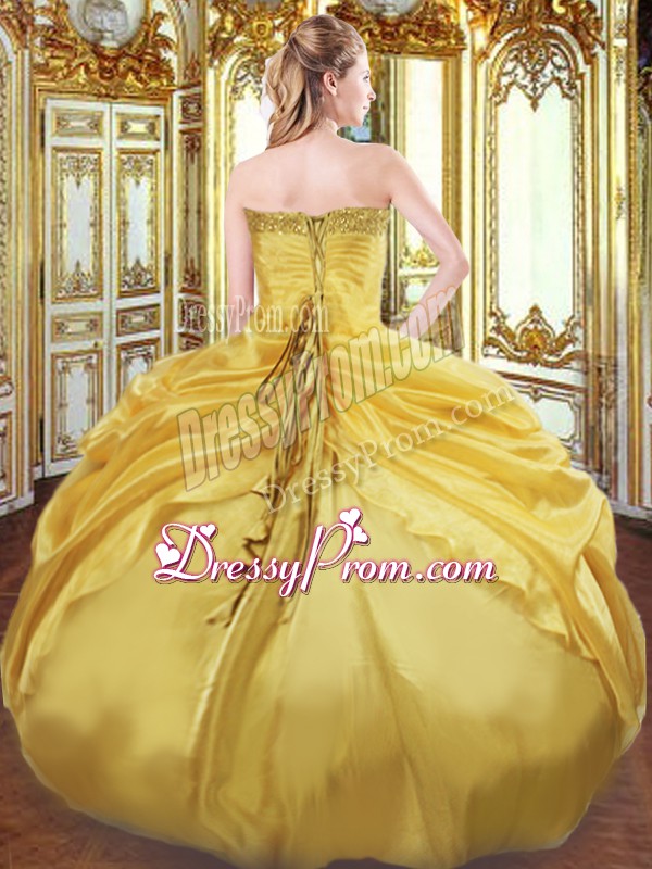 Floor Length Lace Up 15th Birthday Dress Gold for Military Ball and Sweet 16 and Quinceanera with Beading and Pick Ups