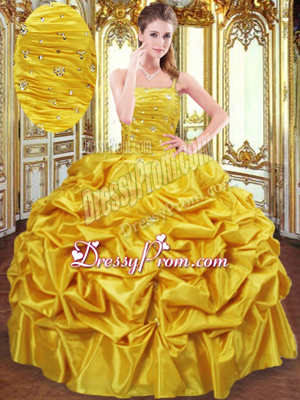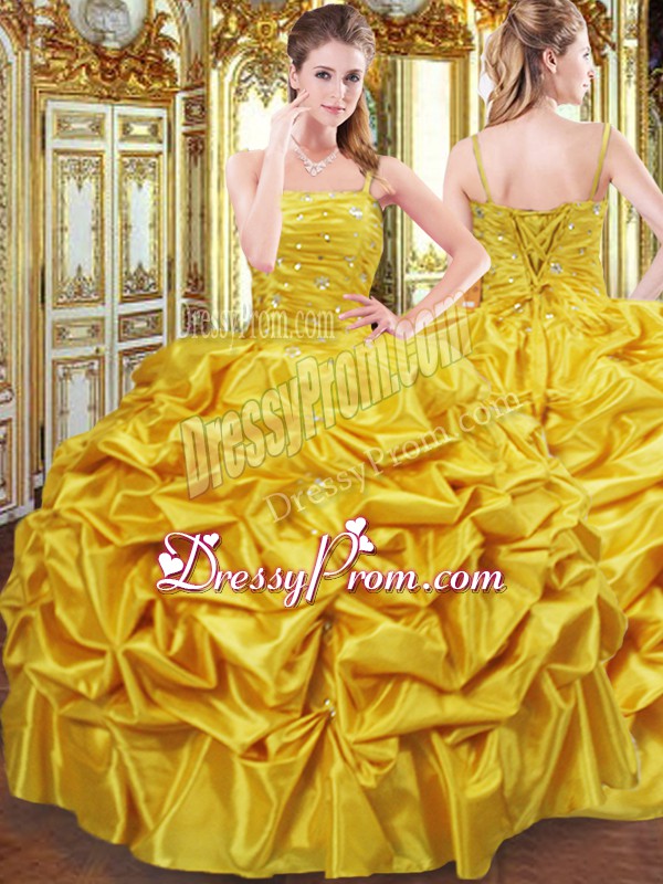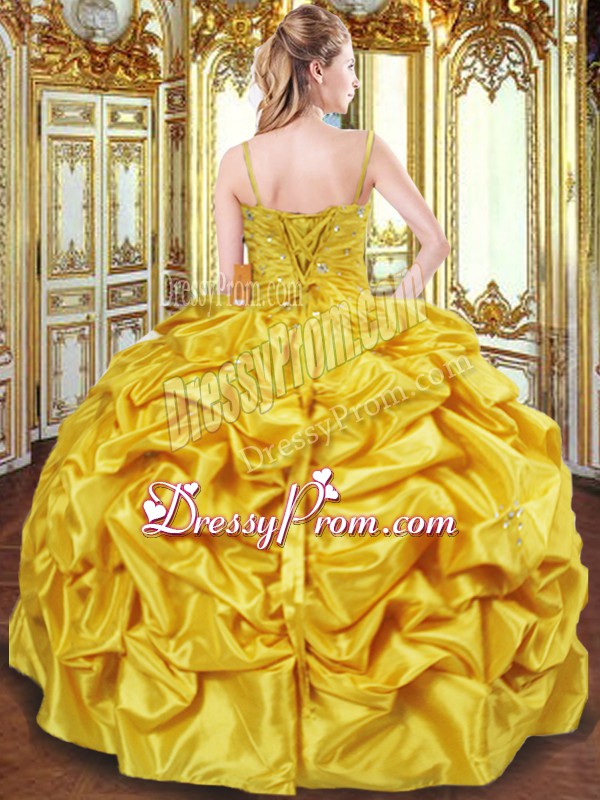 Neckline : Spaghetti strapsShown Color : GoldSilhouette : Ball GownsSleeve Length : sleevelessHemline : floor lengthBack Detail : Lace upFabric : TaffetaEmbellishment : Beading,Pick UpsOccasion : Military Ball,Sweet 16,QuinceaneraSeason : Spring,Summer,Fall,Winter