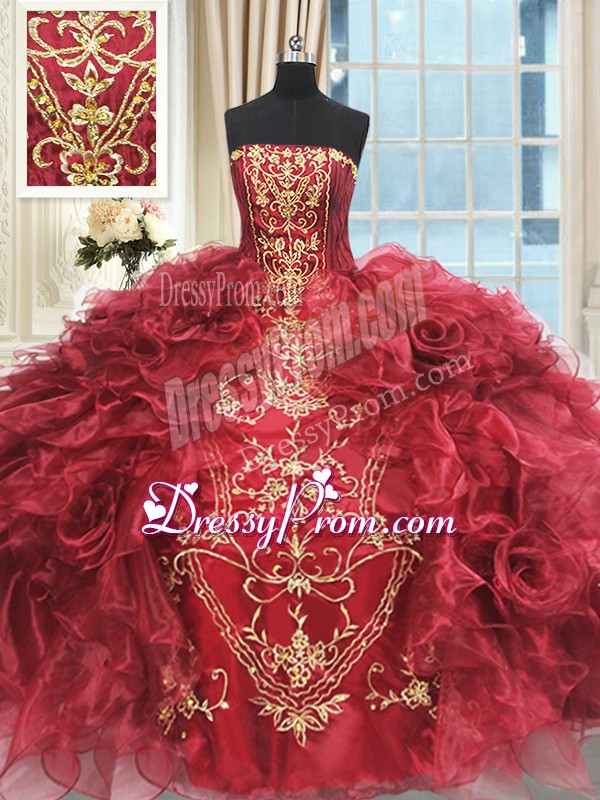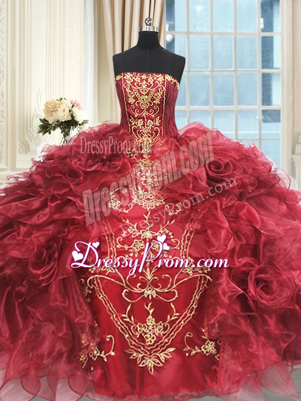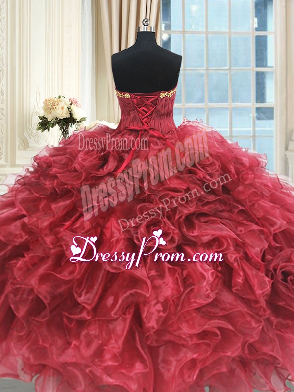 Neckline : StraplessShown Color : Wine RedSilhouette : Ball GownsSleeve Length : sleevelessHemline : floor lengthBack Detail : Lace upFabric : OrganzaEmbellishment : Appliques,RufflesOccasion : Military Ball,Sweet 16,QuinceaneraSeason : Spring,Summer,Fall,Winter