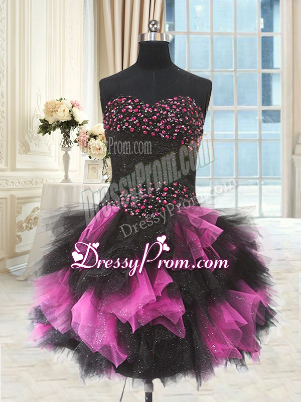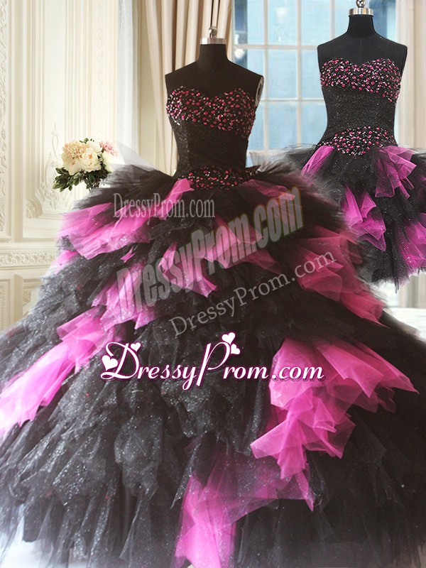 Neckline : Sweetheart Shown Color : Pink And Black Silhouette : Three Pieces Sleeve Length : sleeveless Hemline : floor length Back Detail : Lace up Fabric : Tulle Embellishment : Beading,Ruffles Occasion : Military Ball,Sweet 16,Quinceanera Season : Spring,Summer,Fall,Winter