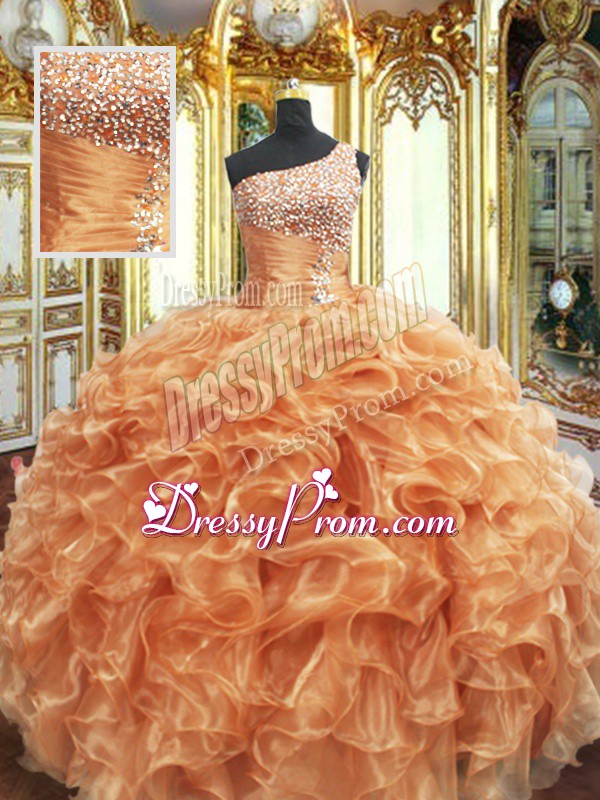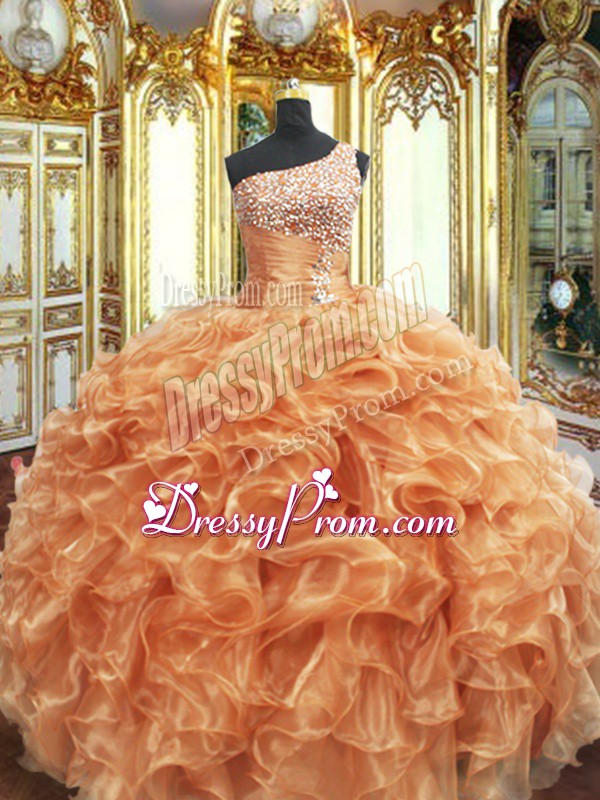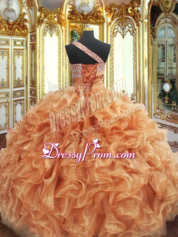 Fancy Orange Ball Gowns Beading and Ruffles 15th Birthday Dress Lace Up Organza Sleeveless Floor Length