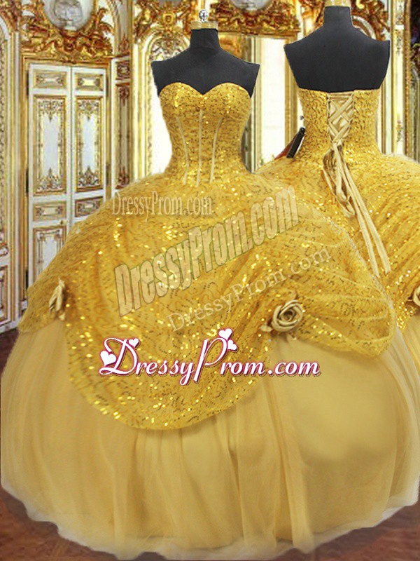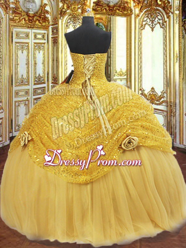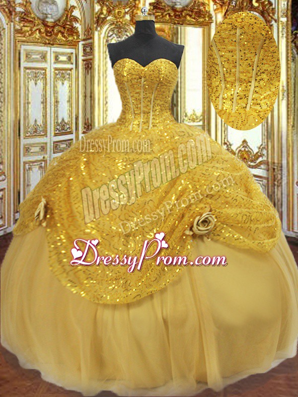 Neckline : SweetheartShown Color : GoldSilhouette : Ball GownsSleeve Length : sleevelessHemline : floor lengthBack Detail : Lace upFabric : TulleEmbellishment : Pick Ups,Hand Made FlowerOccasion : Military Ball,Sweet 16,QuinceaneraSeason : Spring,Summer,Fall,Winter