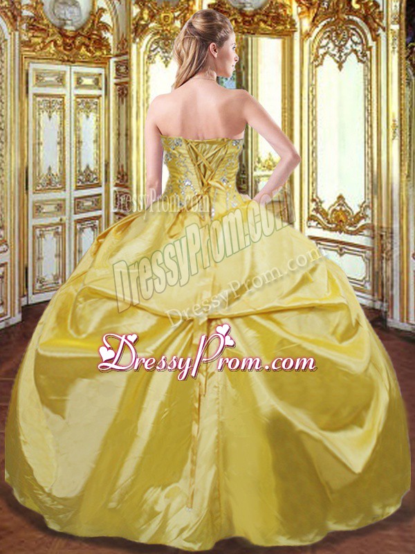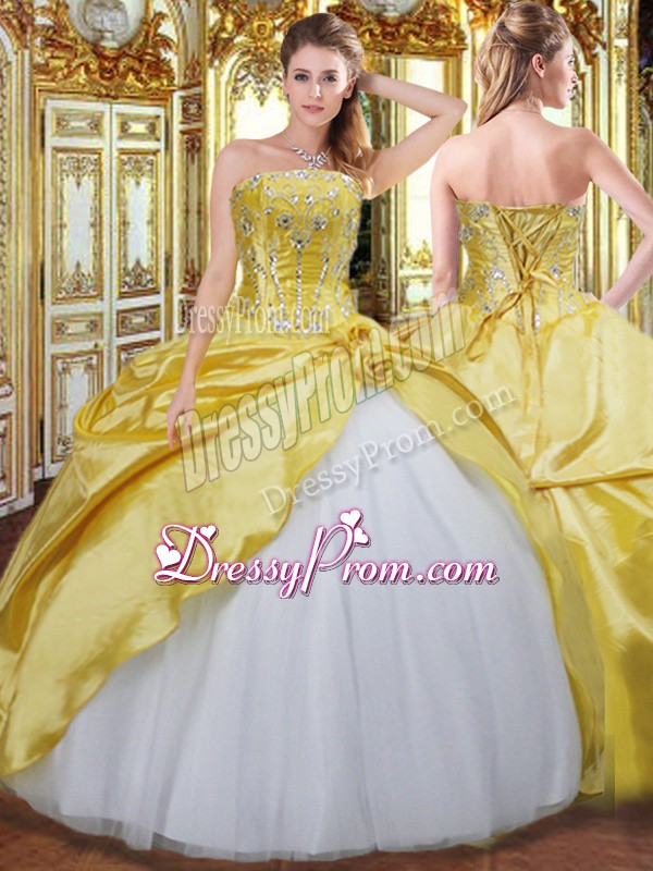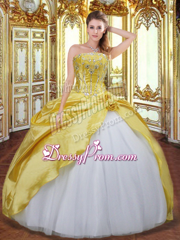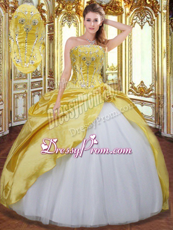 Neckline : StraplessShown Color : GoldSilhouette : Ball GownsSleeve Length : sleevelessHemline : floor lengthBack Detail : Lace upFabric : TaffetaEmbellishment : Beading,Hand Made FlowerOccasion : Military Ball,Sweet 16,QuinceaneraSeason : Spring,Summer,Fall,Winter