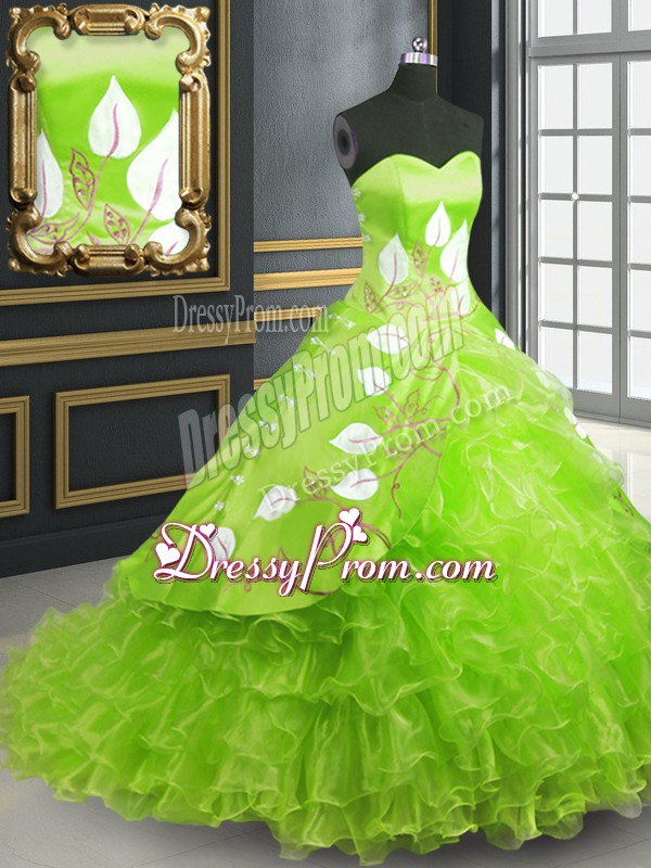 Neckline : SweetheartShown Color : Spring GreenSilhouette : Ball GownsSleeve Length : sleevelessBack Detail : Lace upFabric : OrganzaEmbellishment : EmbroideryOccasion : Military Ball,Sweet 16,QuinceaneraSeason : Spring,Summer,Fall,Winter