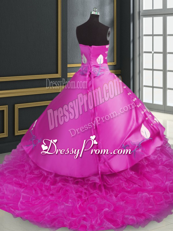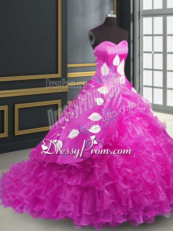 Neckline : SweetheartShown Color : FuchsiaSilhouette : Ball GownsSleeve Length : sleevelessBack Detail : Lace upFabric : OrganzaEmbellishment : Embroidery,RufflesOccasion : Military Ball,Sweet 16,QuinceaneraSeason : Spring,Summer,Fall,Winter