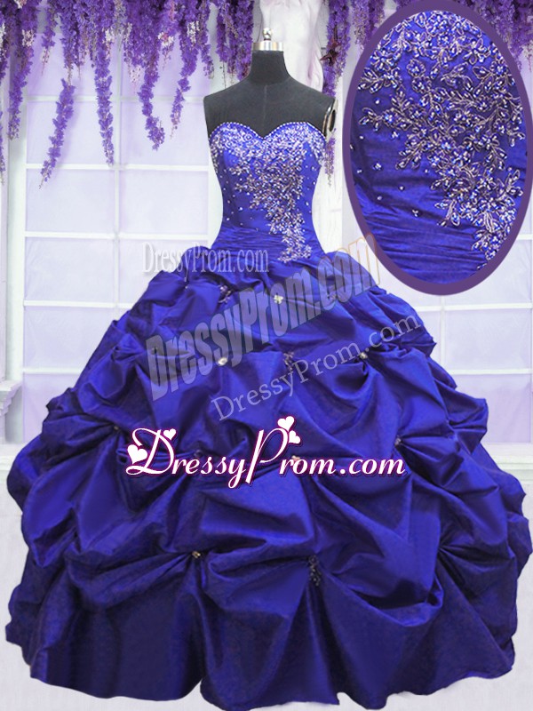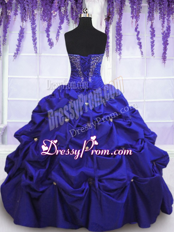 Neckline : SweetheartShown Color : Navy BlueSilhouette : Ball GownsSleeve Length : sleevelessHemline : floor lengthBack Detail : Lace upFabric : TaffetaEmbellishment : Beading,Pick UpsOccasion : Military Ball,Sweet 16,QuinceaneraSeason : Spring,Summer,Fall,Winter