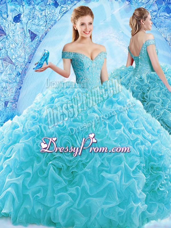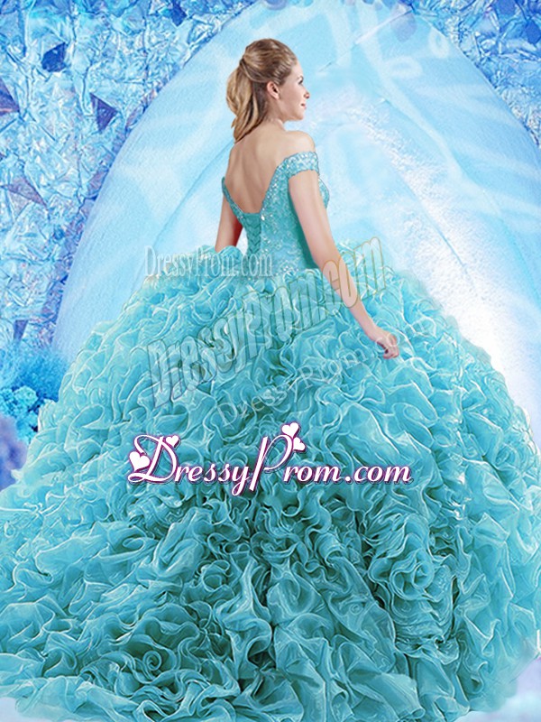 Neckline : Off the shoulder Shown Color : Aqua Blue Silhouette : Ball Gowns Sleeve Length : cap sleeves Back Detail : Lace up Fabric : Organza Embellishment : Ruffles,Pick Ups Occasion : Military Ball,Sweet 16,Quinceanera Season : Spring,Summer,Fall,Winter