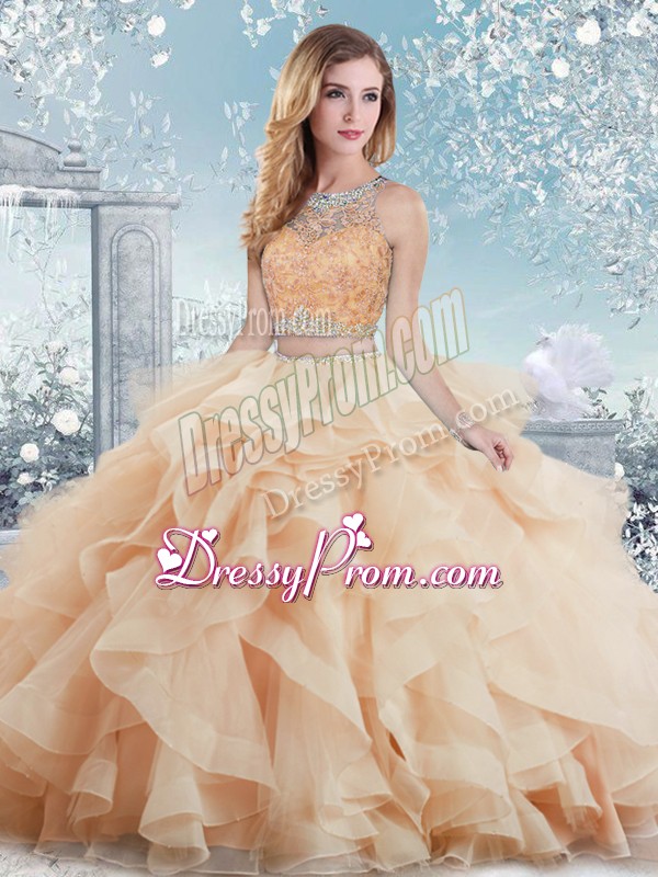 Neckline : ScoopShown Color : PeachSilhouette : Ball GownsSleeve Length : sleevelessHemline : floor lengthBack Detail : Clasp handleFabric : OrganzaEmbellishment : Beading,RufflesOccasion : Military Ball,Sweet 16Season : Spring,Summer,Fall,Winter