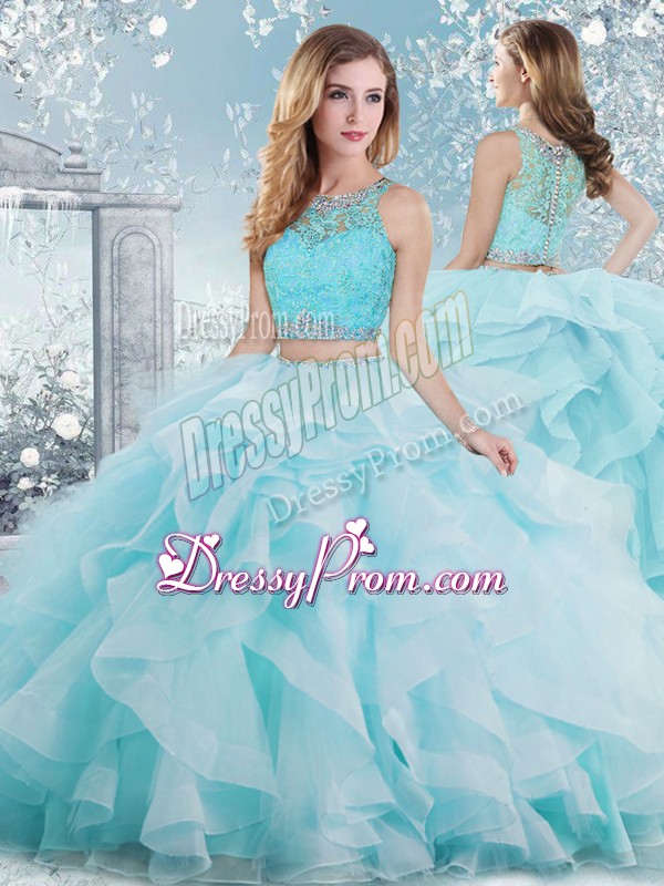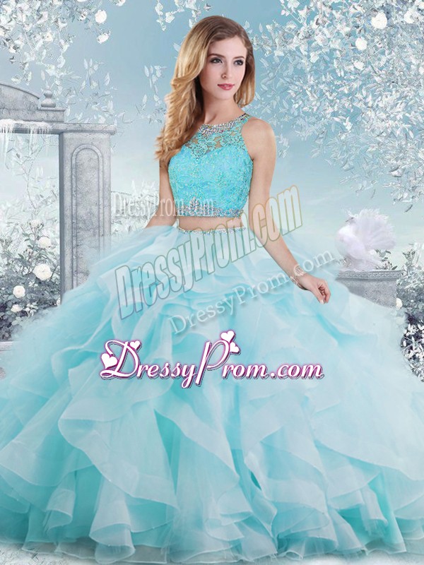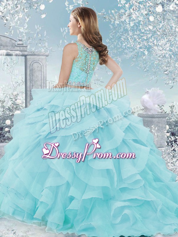 Neckline : ScoopShown Color : Aqua BlueSilhouette : Ball GownsSleeve Length : sleevelessHemline : floor lengthBack Detail : Clasp handleFabric : OrganzaEmbellishment : Beading,RufflesOccasion : Military Ball,Sweet 16,QuinceaneraSeason : Spring,Summer,Fall,Winter