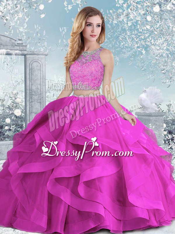 Neckline : ScoopShown Color : FuchsiaSilhouette : Ball GownsSleeve Length : sleevelessHemline : floor lengthBack Detail : Clasp handleFabric : OrganzaEmbellishment : Beading,RufflesOccasion : Military Ball,Sweet 16,QuinceaneraSeason : Spring,Summer,Fall,Winter
