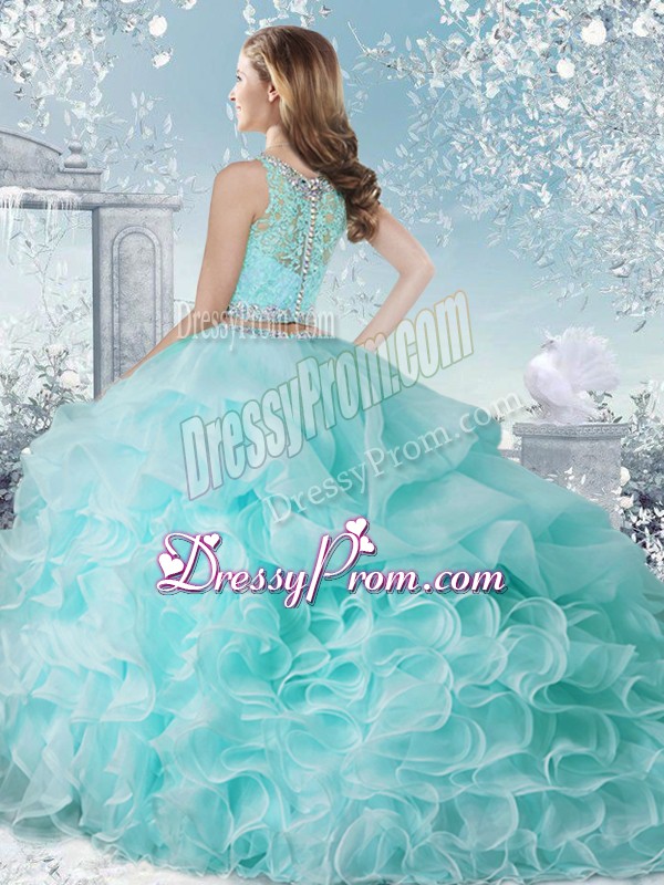 Neckline : ScoopShown Color : Baby BlueSilhouette : Ball GownsSleeve Length : sleevelessHemline : floor lengthBack Detail : Clasp handleFabric : OrganzaEmbellishment : Beading,Ruffles,Pick UpsOccasion : Military Ball,Sweet 16,QuinceaneraSeason : Spring,Summer,Fall,Winter