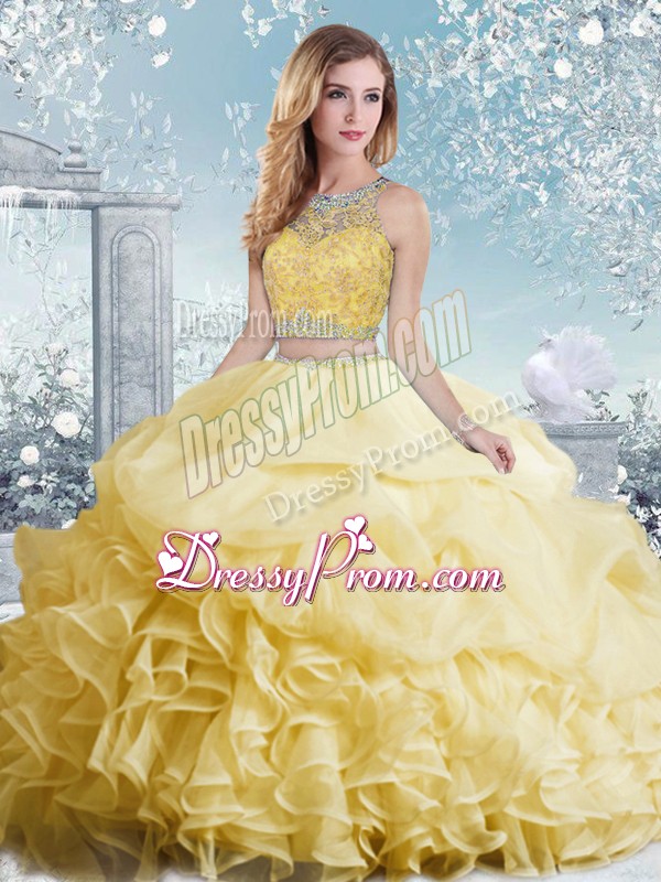 Neckline : BateauShown Color : YellowSilhouette : Two PiecesSleeve Length : sleevelessHemline : floor lengthBack Detail : Clasp handleFabric : OrganzaEmbellishment : Beading,Ruffles,Pick UpsOccasion : Military Ball,Sweet 16,QuinceaneraSeason : Spring,Summer,Fall,Winter