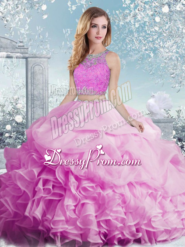Neckline : ScoopShown Color : LilacSilhouette : Two PiecesSleeve Length : sleevelessHemline : floor lengthBack Detail : Clasp handleFabric : OrganzaEmbellishment : Beading,Ruffles,Pick UpsOccasion : Military Ball,Sweet 16,QuinceaneraSeason : Spring,Summer,Fall,Winter