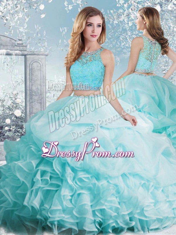 Neckline : ScoopShown Color : Aqua BlueSilhouette : Two PiecesSleeve Length : sleevelessHemline : floor lengthBack Detail : Clasp handleFabric : OrganzaEmbellishment : Beading,Ruffles,Pick UpsOccasion : Military Ball,Sweet 16,QuinceaneraSeason : Spring,Summer,Fall,Winter