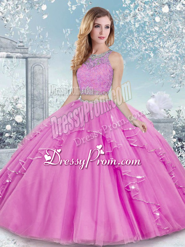 Neckline : ScoopShown Color : LilacSilhouette : Two PiecesSleeve Length : sleevelessHemline : floor lengthBack Detail : Clasp handleFabric : TulleEmbellishment : Beading,LaceOccasion : Military Ball,Sweet 16,QuinceaneraSeason : Spring,Summer,Fall,Winter
