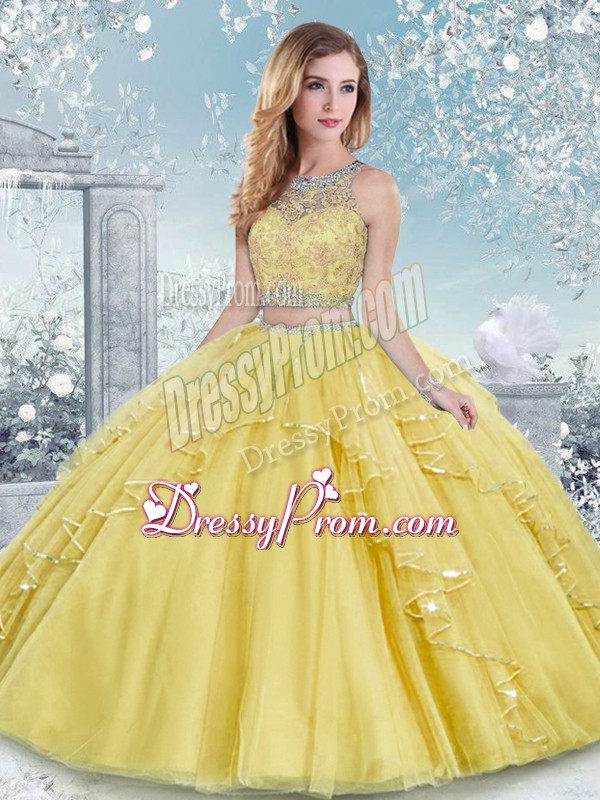 Neckline : ScoopShown Color : GoldSilhouette : Two PiecesSleeve Length : sleevelessHemline : floor lengthBack Detail : Clasp handleFabric : TulleEmbellishment : Beading,LaceOccasion : Military Ball,Sweet 16,QuinceaneraSeason : Spring,Summer,Fall,Winter