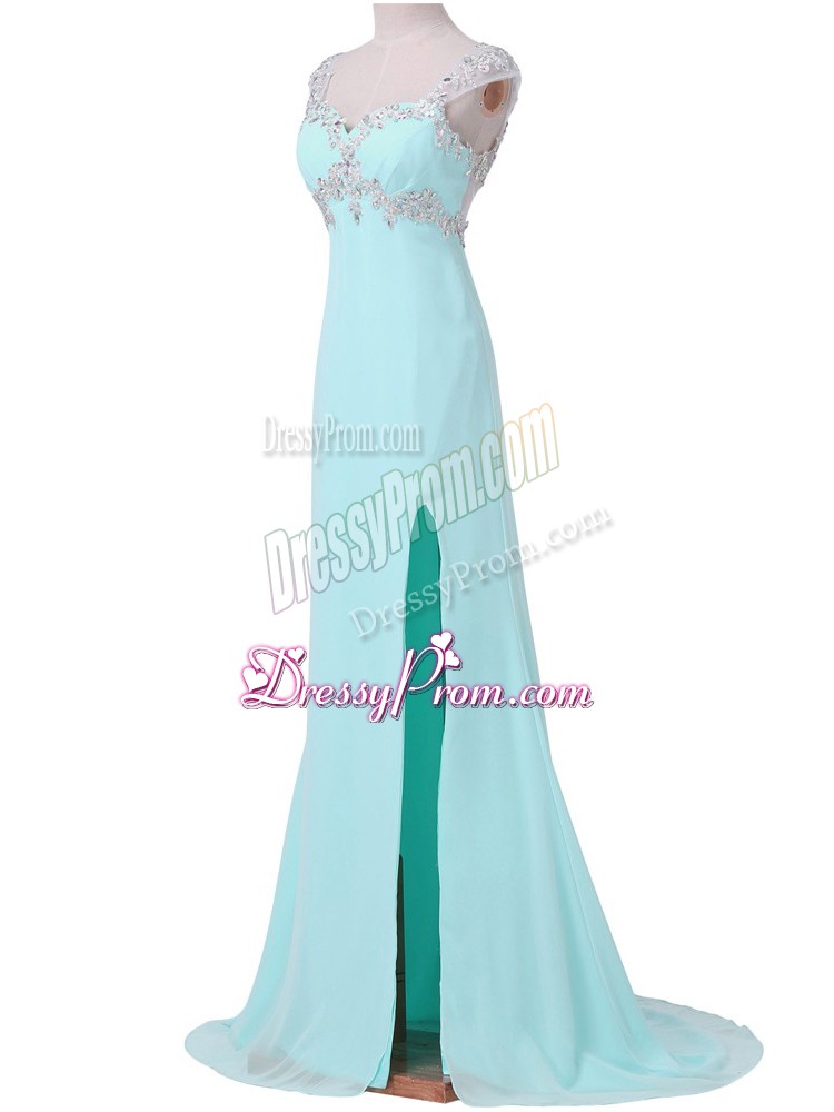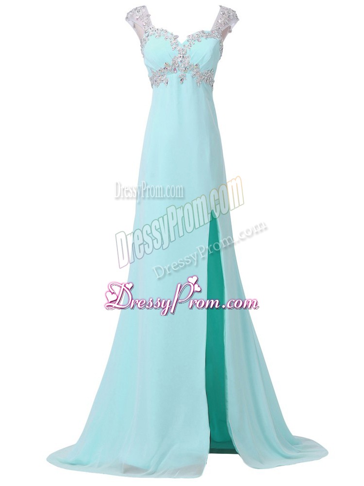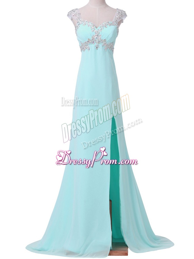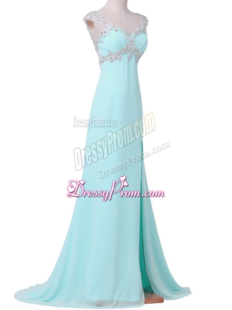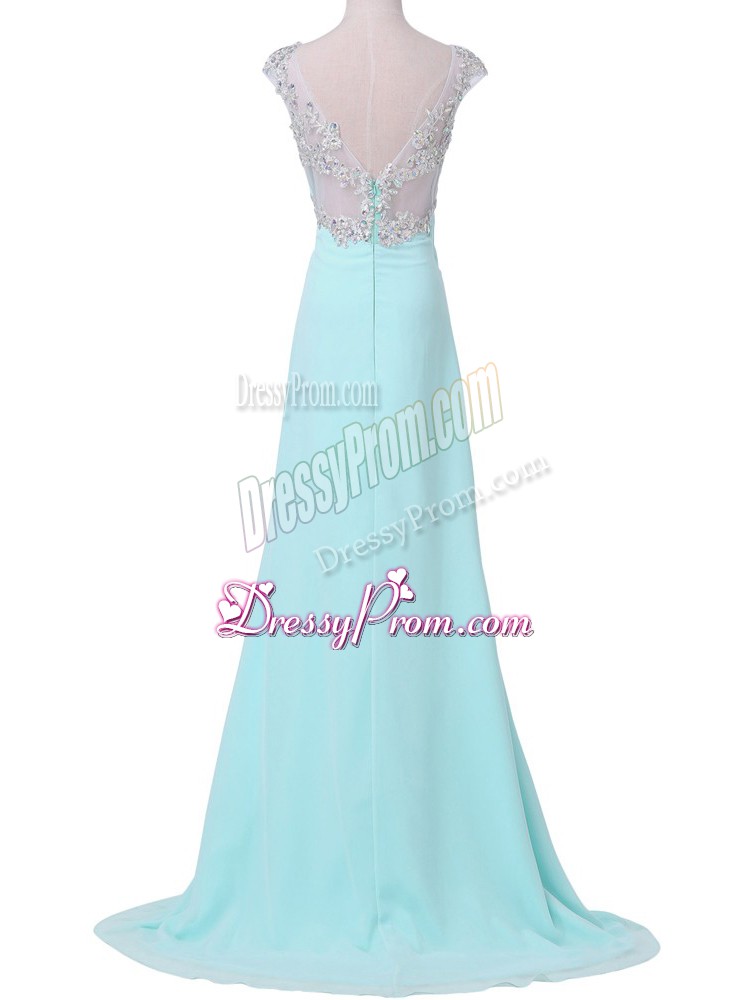 Neckline : SweetheartShown Color : Aqua BlueSilhouette : Column/SheathSleeve Length : cap sleevesBack Detail : BacklessFabric : ChiffonEmbellishment : BeadingOccasion : Prom,Party,Military BallSeason : Spring,Summer,Fall,Winter