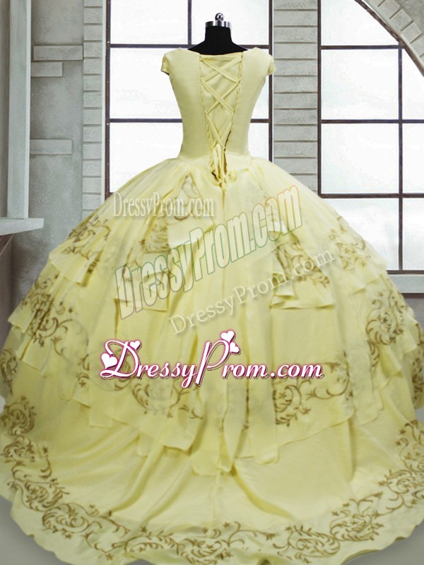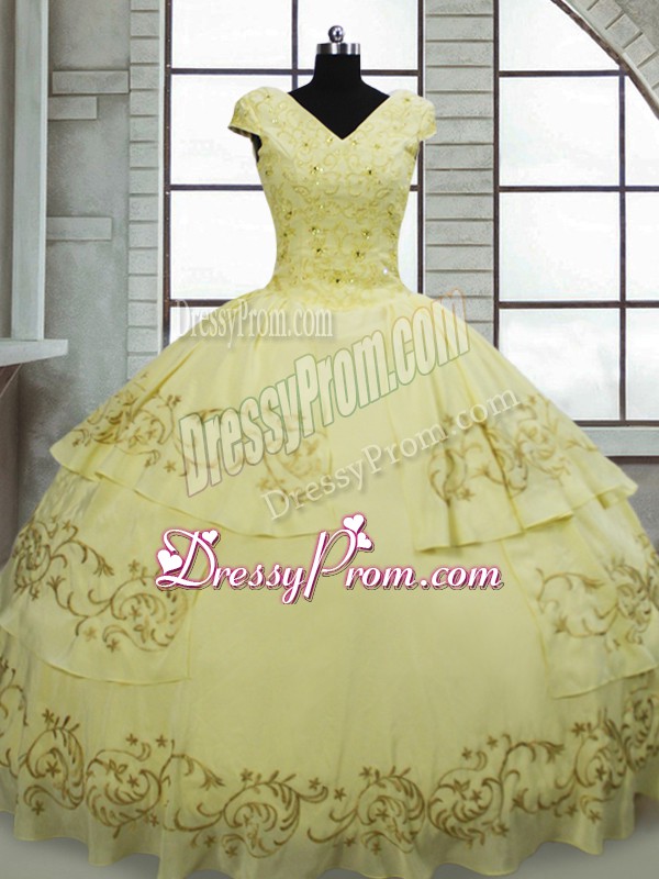 Neckline : V-neckShown Color : Light YellowSilhouette : Ball GownsSleeve Length : cap sleevesBack Detail : Lace upFabric : Satin,ChiffonEmbellishment : Beading,EmbroideryOccasion : Military Ball,Sweet 16,QuinceaneraSeason : Spring,Summer,Fall,Winter