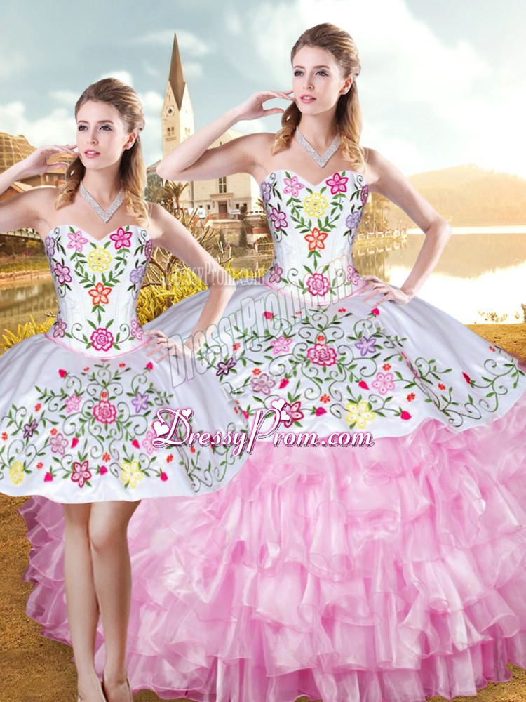 Neckline : SweetheartShown Color : Rose Pink Silhouette : Three PiecesSleeve Length : sleevelessHemline : floor lengthBack Detail : Lace upFabric : Organza,TaffetaEmbellishment : Embroidery,Ruffled LayersOccasion : Military Ball,Sweet 16,QuinceaneraSeason : Spring,Summer,Fall,Winter