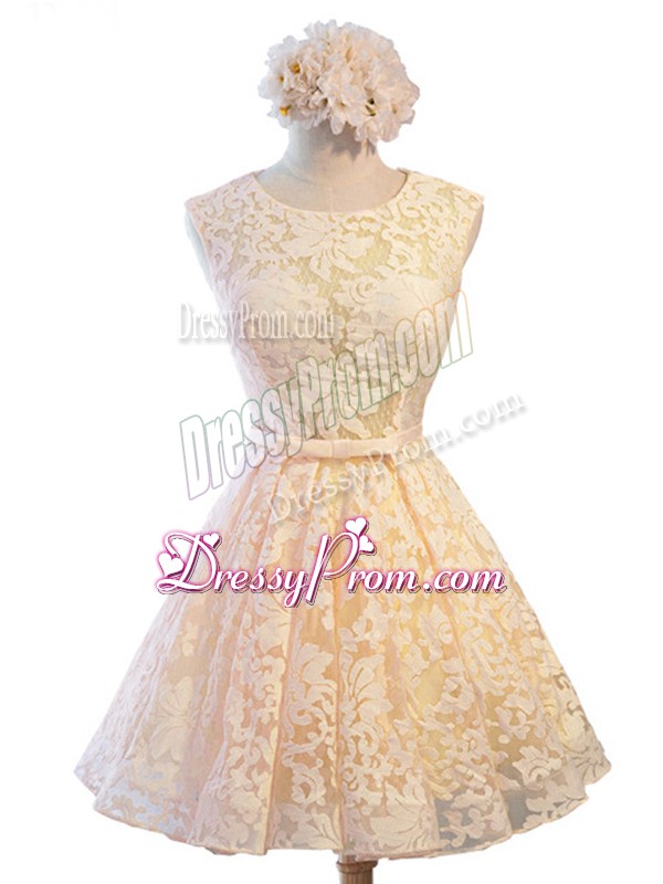 Neckline : ScoopShown Color : ChampagneSilhouette : A-lineSleeve Length : sleevelessHemline : knee lengthBack Detail : Lace upFabric : LaceEmbellishment : BeltOccasion : Prom,Party,Wedding PartySeason : Spring,Summer,Fall