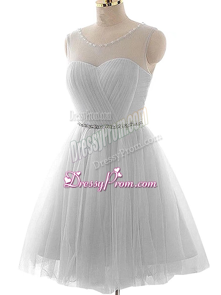 Neckline : ScoopShown Color : GreySilhouette : A-lineSleeve Length : sleevelessHemline : mini lengthBack Detail : Lace upFabric : TulleEmbellishment : Beading,RuchingOccasion : Prom,Party,Sweet 16Season : Spring,Summer,Fall