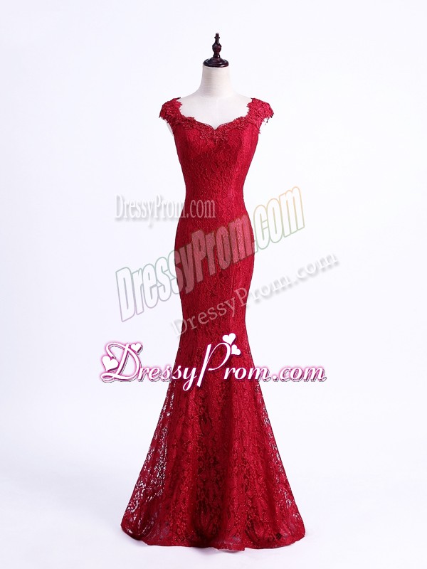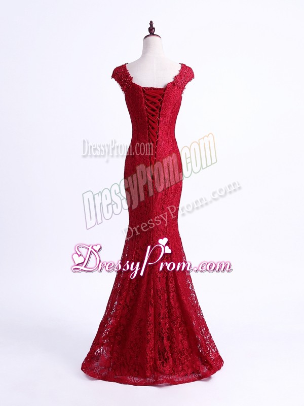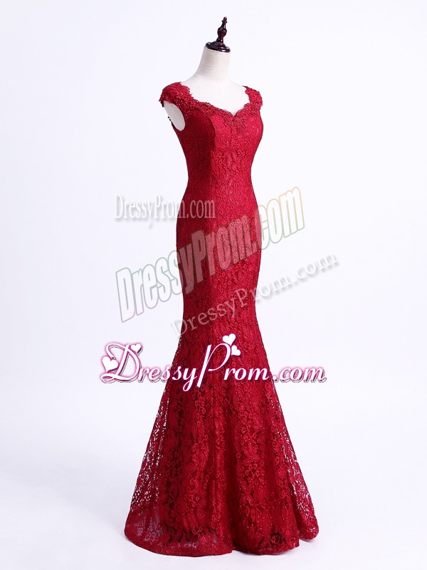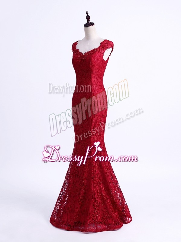 Neckline : ScallopedShown Color : RedSilhouette : MermaidSleeve Length : sleevelessHemline : floor lengthBack Detail : Lace upFabric : LaceEmbellishment : LaceOccasion : Prom,Party,Military Ball,Sweet 16Season : Spring,Summer,Fall,Winter