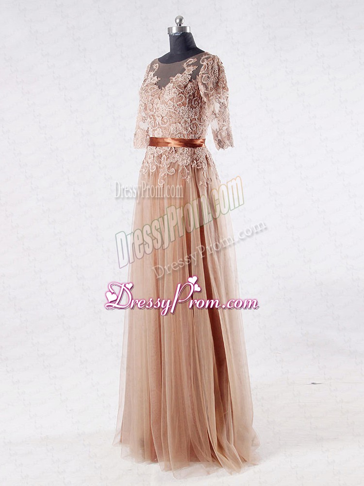 Neckline : ScoopShown Color : BrownSilhouette : EmpireSleeve Length : half sleevesHemline : floor lengthBack Detail : ZipperFabric : TulleEmbellishment : Lace,AppliquesOccasion : Prom,Military Ball,Sweet 16Season : Spring,Summer,Fall,Winter