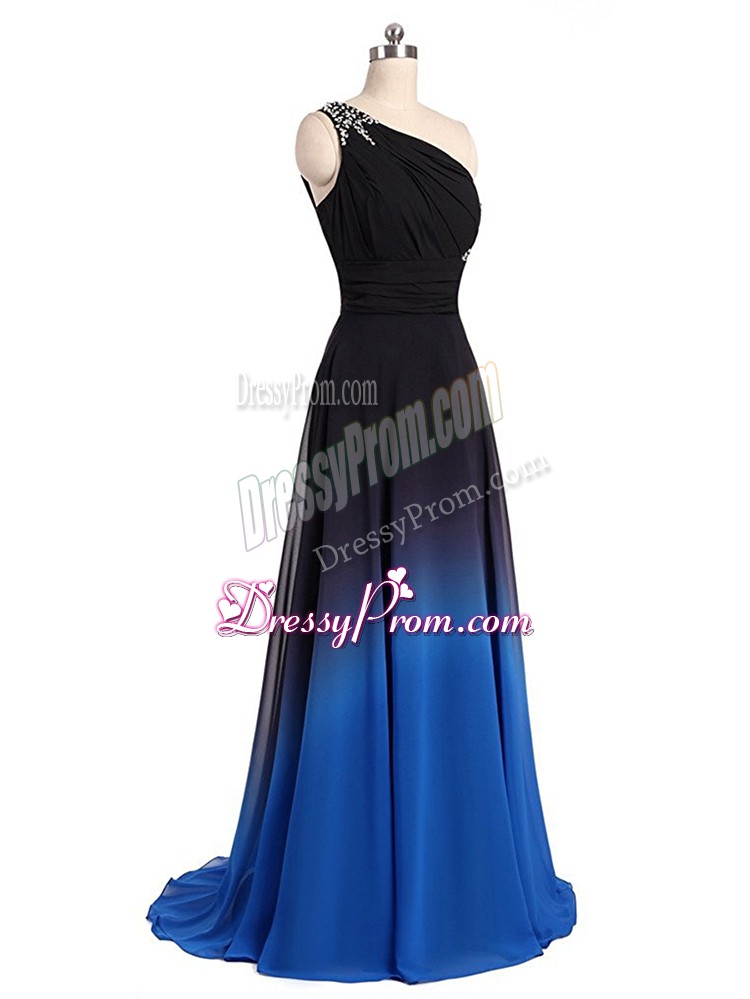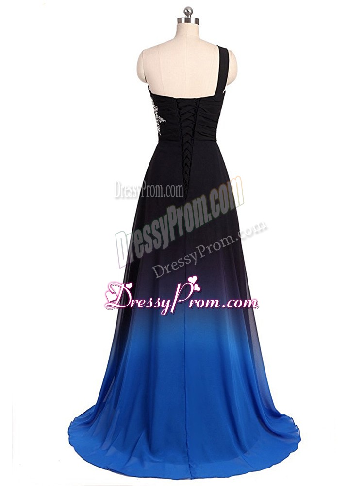 Neckline : One shoulderShown Color : Multi-colorSilhouette : EmpireSleeve Length : sleevelessBack Detail : Lace upFabric : ChiffonEmbellishment : Beading,RuchingOccasion : Prom,Party,Military BallSeason : Spring,Summer,Fall,Winter