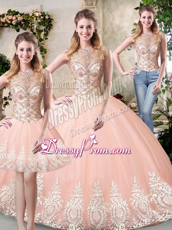 Comfortable Peach Quince Ball Gowns Prom and Party and Military Ball and Sweet 16 and Quinceanera with Beading and Lace and Appliques High-neck Sleeveless Backless