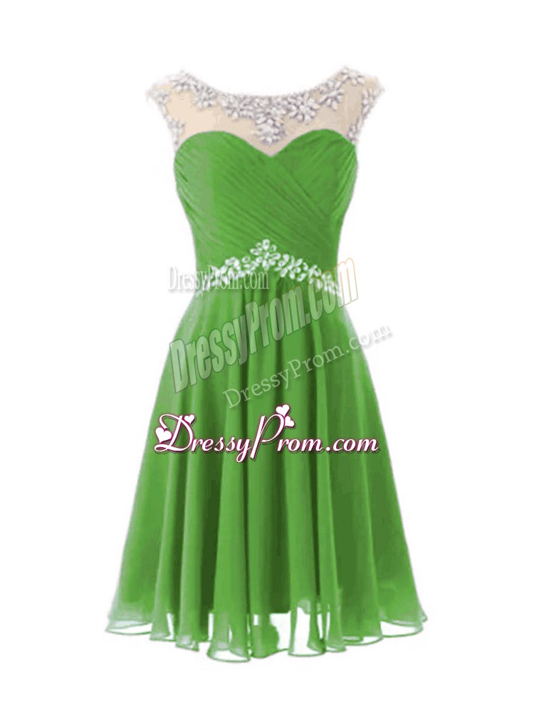 Neckline : ScoopShown Color : Spring GreenSilhouette : A-lineSleeve Length : cap sleevesHemline : knee lengthBack Detail : ZipperFabric : ChiffonEmbellishment : BeadingOccasion : Prom,PartySeason : Spring,Summer,Fall