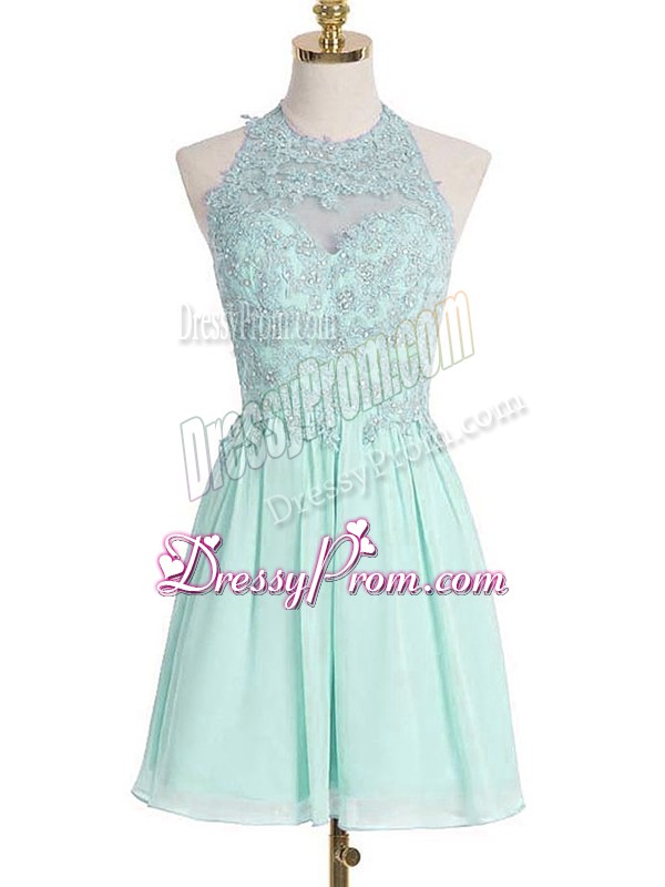 Neckline : Halter top Shown Color : Apple Green Silhouette : Empire Sleeve Length : sleeveless Hemline : knee length Back Detail : Lace up Fabric : Chiffon Embellishment : Appliques Occasion : Prom,Party,Wedding Party Season : Spring,Summer,Fall