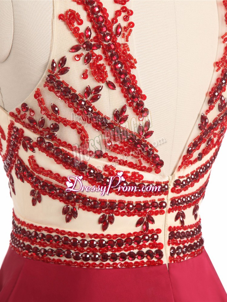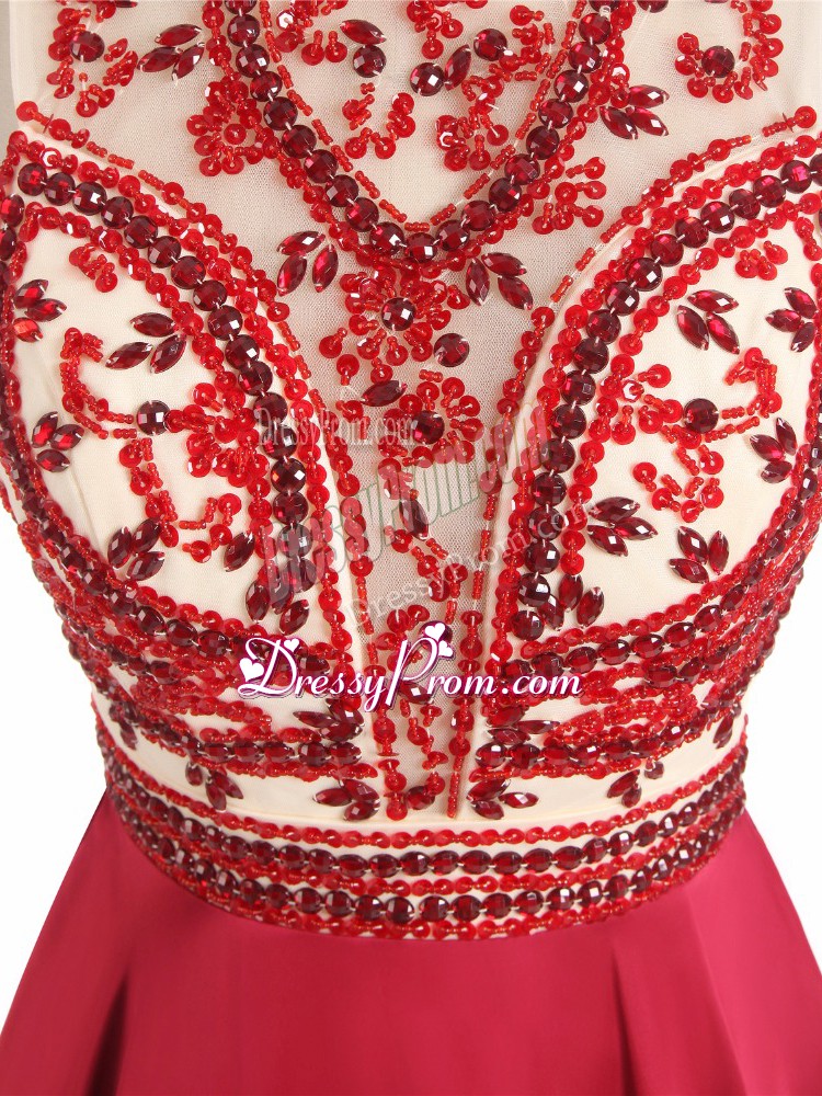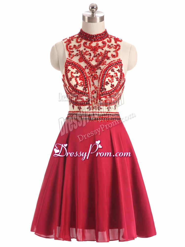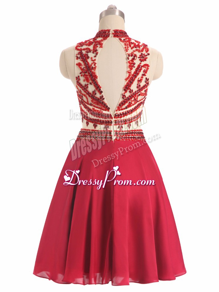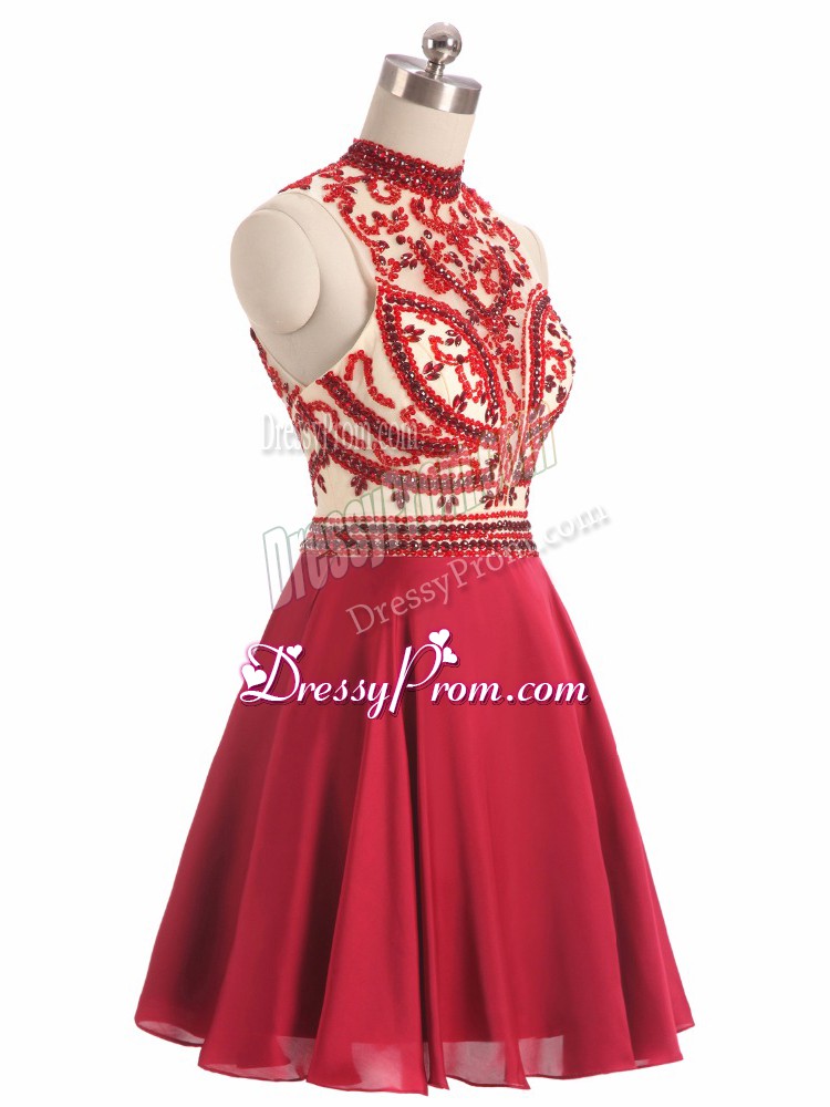 Neckline : Halter topShown Color : RedSilhouette : A-lineSleeve Length : sleevelessHemline : mini lengthBack Detail : BacklessFabric : ChiffonEmbellishment : BeadingOccasion : Prom,Party,Military BallSeason : Spring,Summer,Fall
