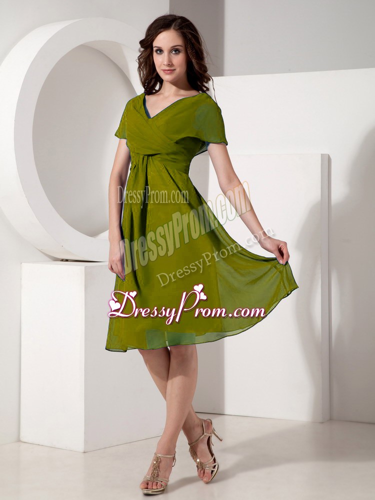 Neckline : V-neckShown Color : Olive GreenSilhouette : EmpireSleeve Length : short sleevesHemline : knee lengthBack Detail : ZipperFabric : ChiffonEmbellishment : RuchingOccasion : Prom,PartySeason : Spring,Summer,Fall