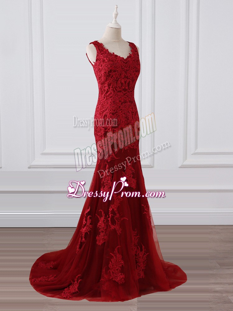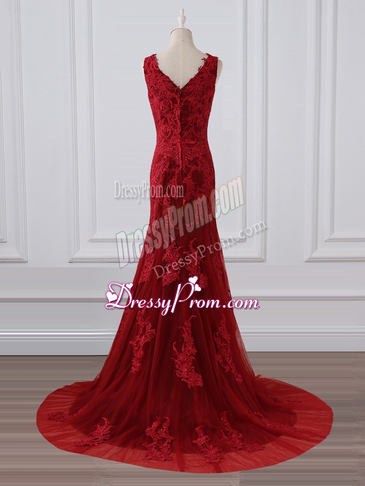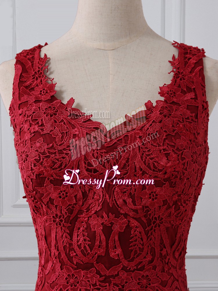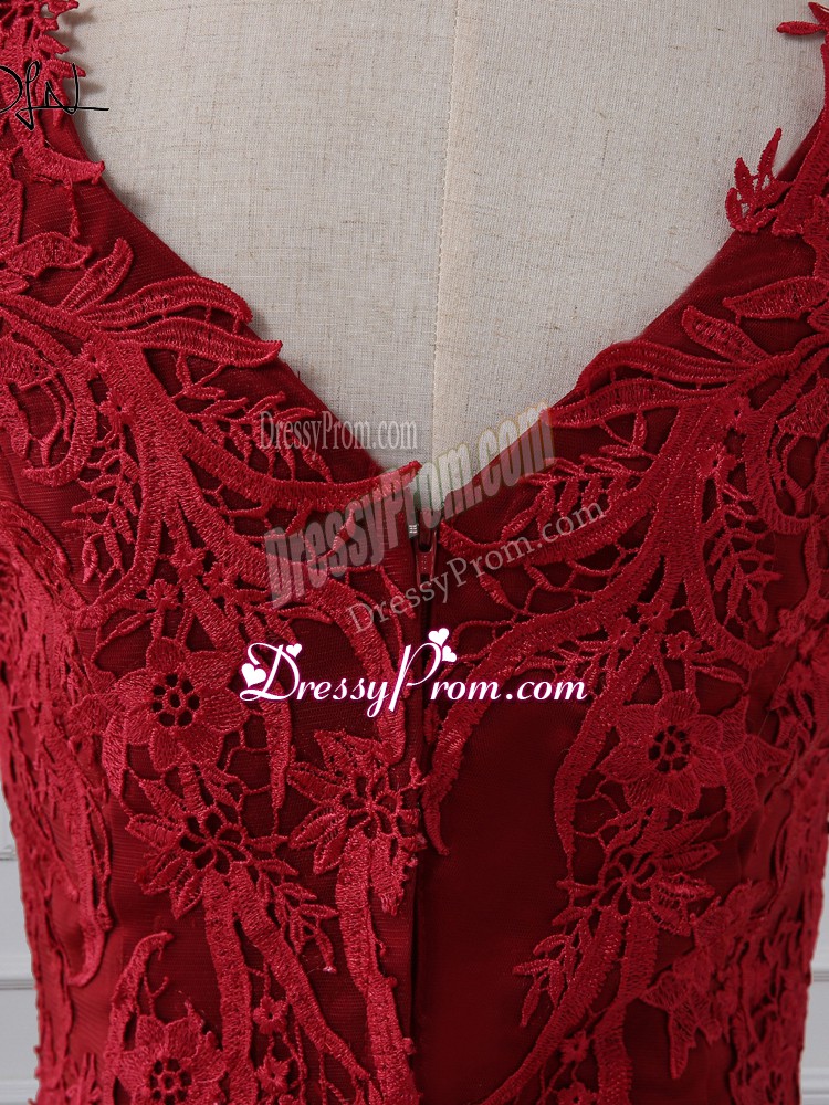 Neckline : V-neckShown Color : RedSilhouette : MermaidSleeve Length : sleevelessBack Detail : ZipperFabric : LaceEmbellishment : Lace,AppliquesOccasion : Prom,Military Ball,Wedding PartySeason : Spring,Summer,Fall,Winter