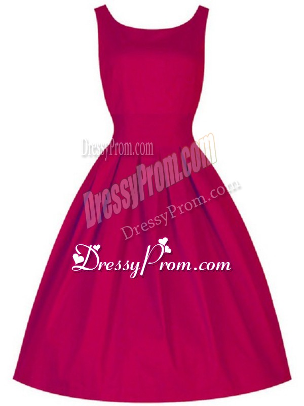Neckline : ScoopShown Color : FuchsiaSilhouette : A-lineSleeve Length : sleevelessHemline : knee lengthBack Detail : Lace upFabric : TaffetaEmbellishment : RuchingOccasion : Prom,Party,Wedding PartySeason : Spring,Summer