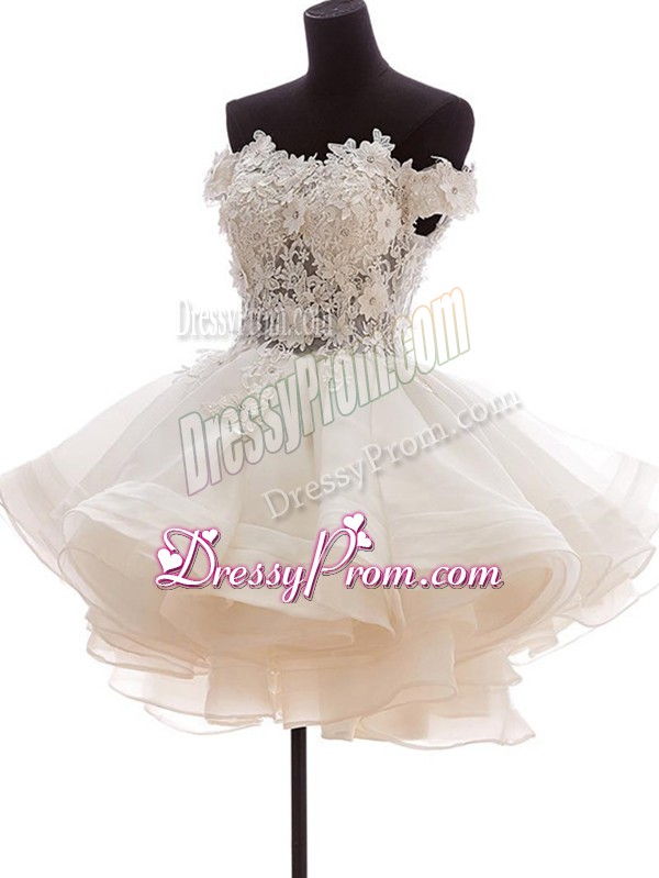 Neckline : Off the shoulderShown Color : Pink Silhouette : A-lineSleeve Length : sleevelessHemline : mini lengthBack Detail : ZipperFabric : TaffetaEmbellishment : Lace,Appliques,RufflesOccasion : Prom,Party,Military Ball,Sweet 16Season : Spring,Summer,Fall