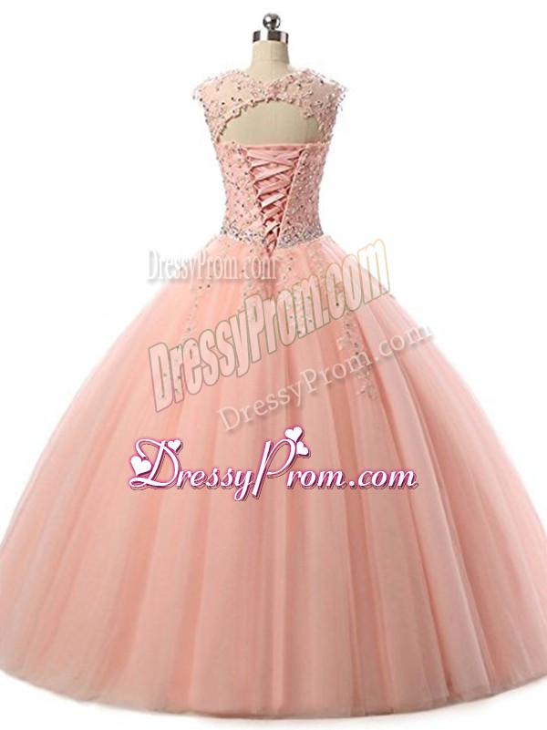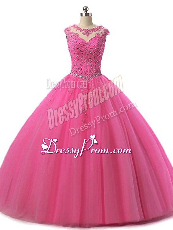 Neckline : ScoopShown Color : Hot PinkSilhouette : Ball GownsSleeve Length : sleevelessHemline : floor lengthBack Detail : Lace upFabric : TulleEmbellishment : Beading,LaceOccasion : Military Ball,Sweet 16,QuinceaneraSeason : Spring,Summer,Fall,Winter
