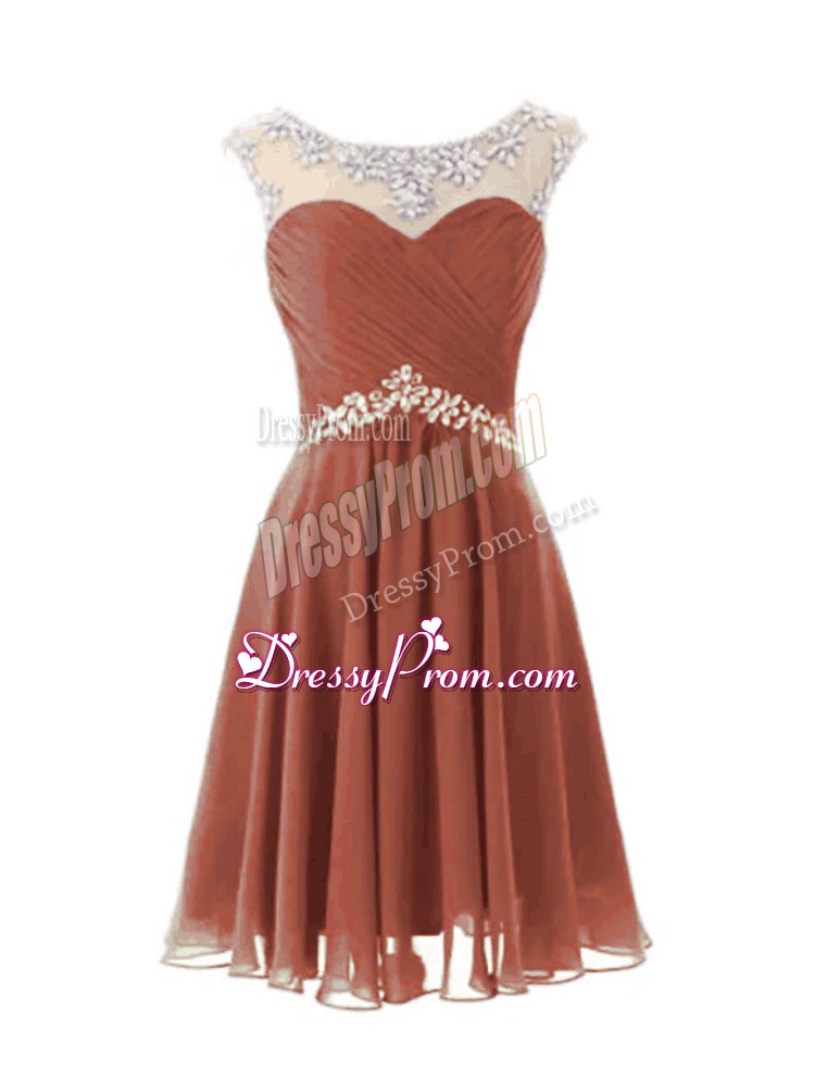 Neckline : ScoopShown Color : BrownSilhouette : A-lineSleeve Length : cap sleevesHemline : knee lengthBack Detail : ZipperFabric : ChiffonEmbellishment : BeadingOccasion : Prom,PartySeason : Spring,Summer,Fall