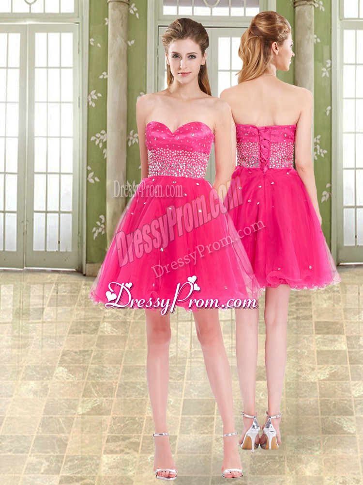Neckline : SweetheartShown Color : Hot PinkSilhouette : A-lineSleeve Length : sleevelessHemline : mini lengthBack Detail : Lace upFabric : TulleEmbellishment : Beading,RufflesOccasion : Prom,Party,Sweet 16Season : Spring,Summer,Fall
