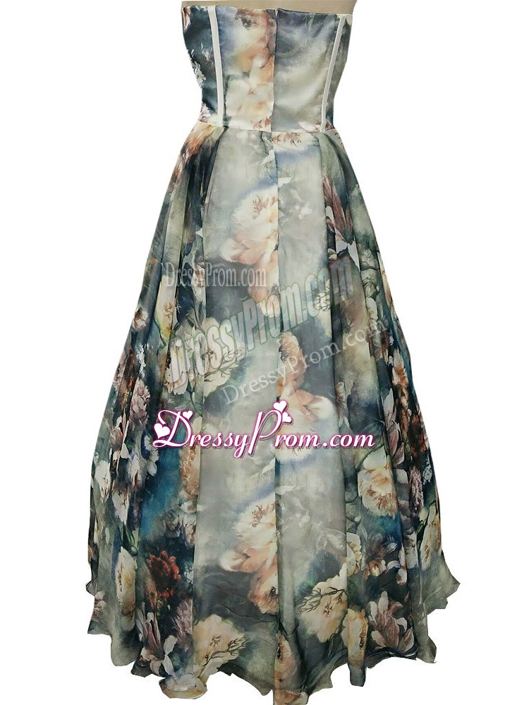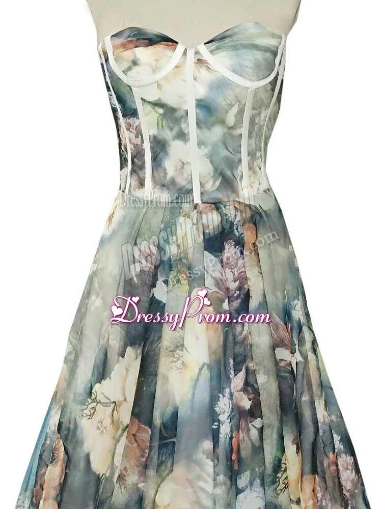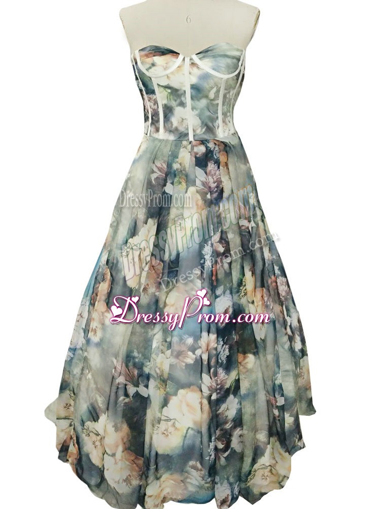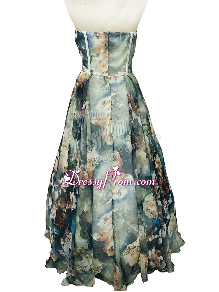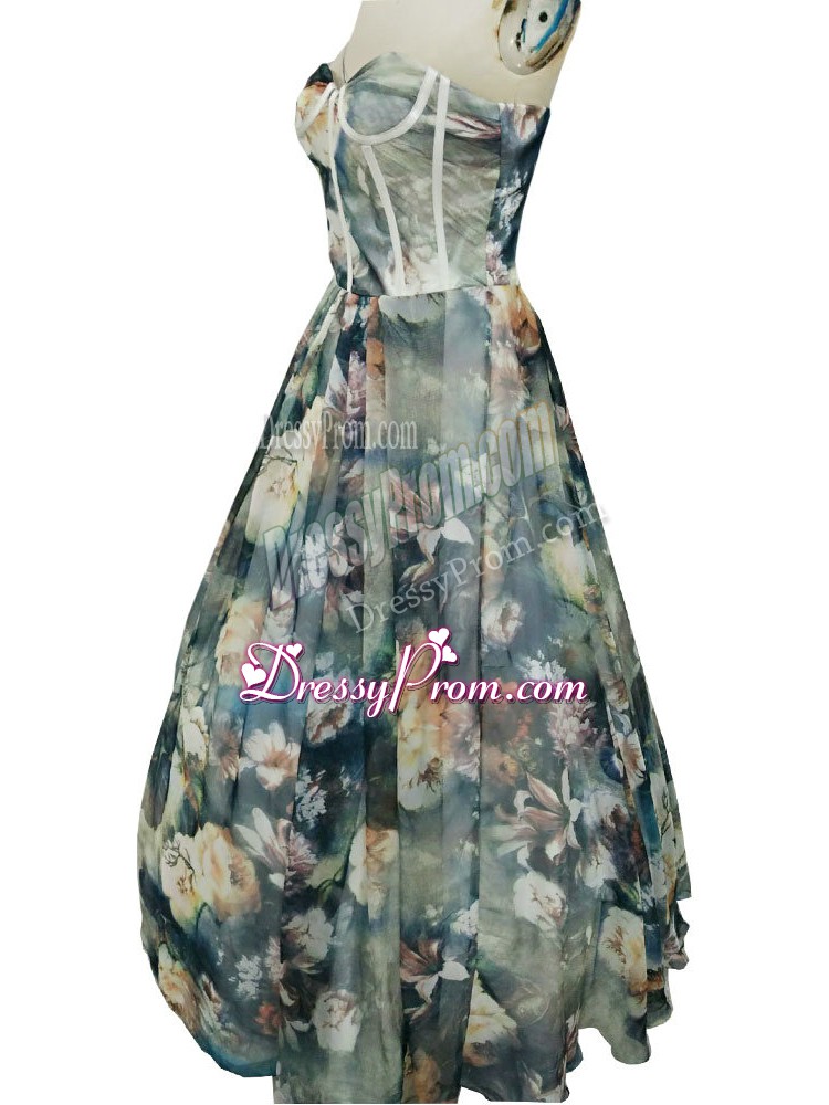 Neckline : SweetheartShown Color : Multi-colorSilhouette : A-lineSleeve Length : sleevelessHemline : floor lengthBack Detail : ZipperFabric : PrintedEmbellishment : RuchingOccasion : Prom,Military Ball,BeachSeason : Spring,Summer,Fall,Winter
