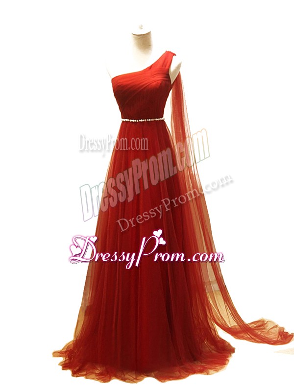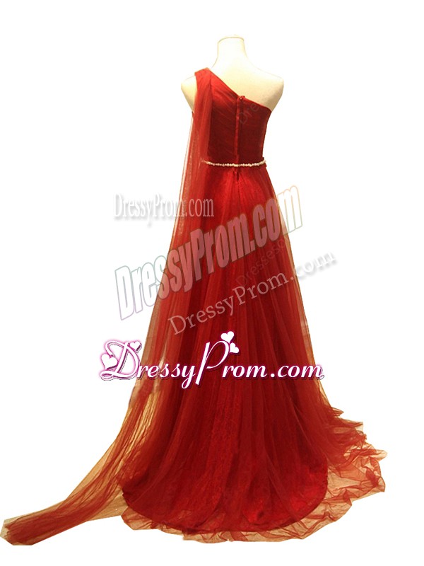 Neckline : One shoulderShown Color : Rust RedSilhouette : EmpireSleeve Length : sleevelessBack Detail : ZipperFabric : TulleEmbellishment : Beading,RuchingOccasion : Prom,Sweet 16Season : Spring,Summer,Fall,Winter