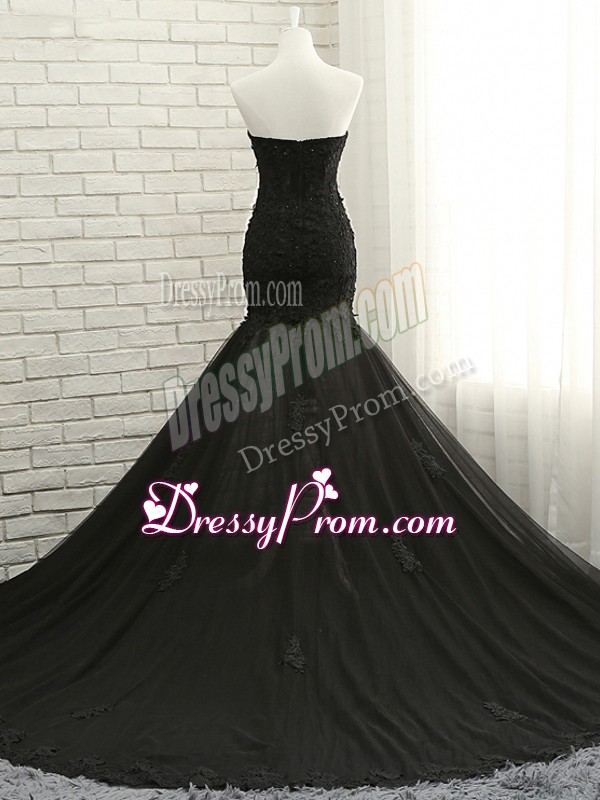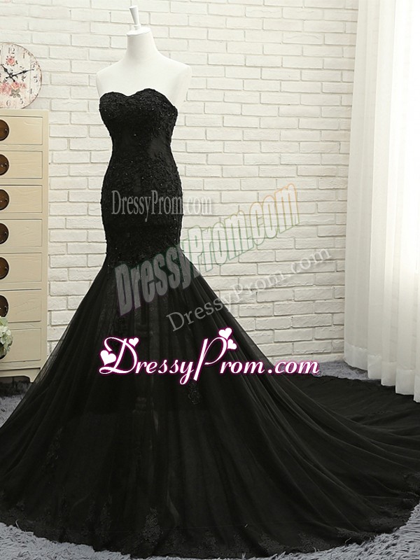Neckline : SweetheartShown Color : BlackSilhouette : MermaidSleeve Length : sleevelessBack Detail : Lace upFabric : TulleEmbellishment : Lace,AppliquesOccasion : Prom,PartySeason : Spring,Summer,Fall,Winter